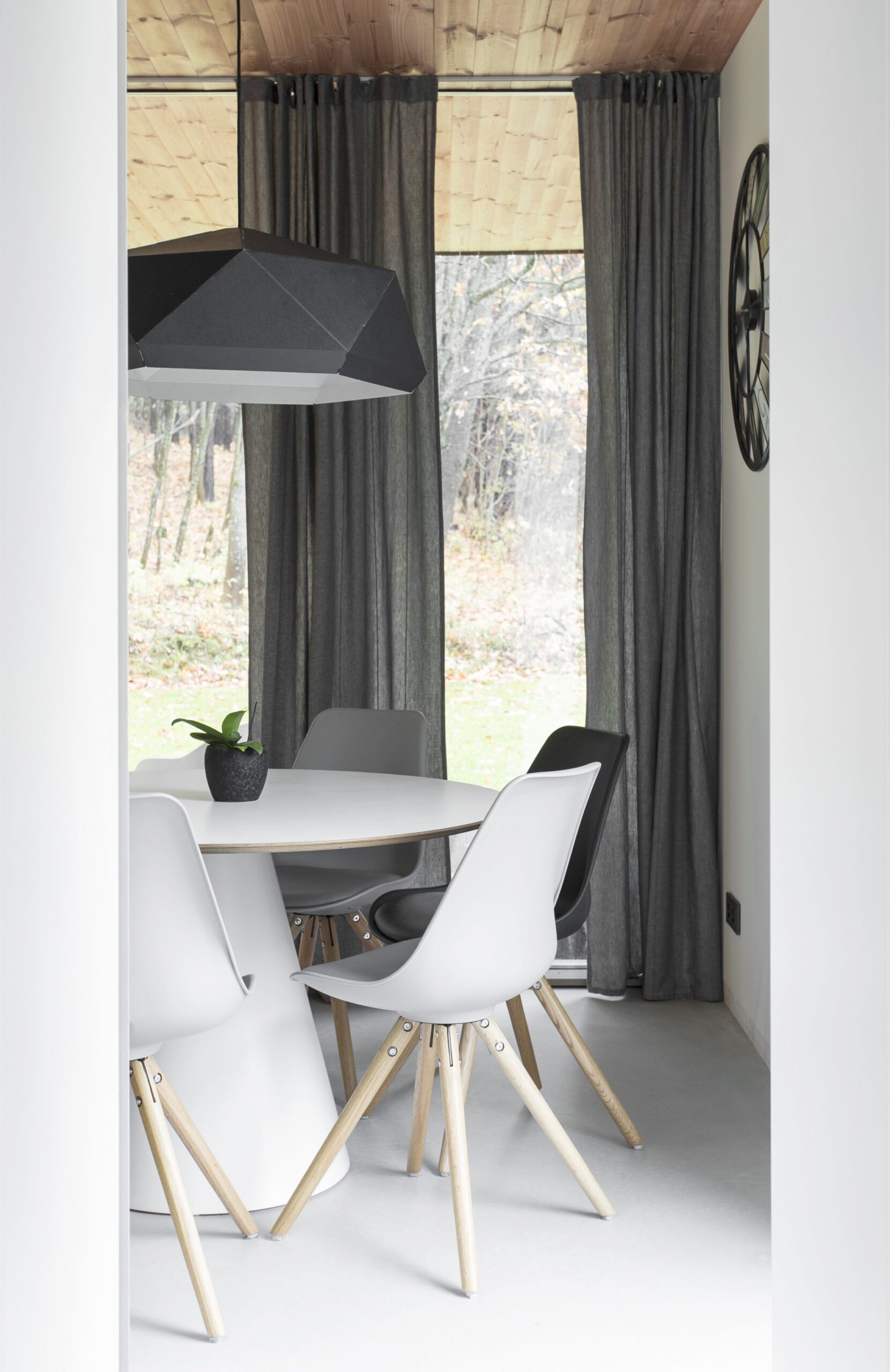 Visai šalia esantis miškas apgaubia namelį savita aura. Architektas mano, kad interjerui jaukumo suteikia gausus natūralus apšvietimas ir erdvių santykis – svetainės, virtuvės, terasos, miško… „Būdamas čia, visą laiką jautiesi tarsi ne namie, o kokiame nors miške, jaukioje pavėsinėje, kur šilta ir gera.“