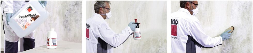 Prieš perdažant fasadą, šių kenkėjų būtina atsikratyti: visą pažeistą plotą (o turint galimybę – visą fasadą, mat mikroorganizmų sporos jau gali būti išsisėjusios) reikia apdoroti specialia priemone „Baumit FungoFluid“. Tai paruoštas naudoti vandens pagrindo tirpalas, skirtas dumblių ar grybelių pažeistiems fasadams. Praėjus kuriam laikui, „Baumit FungoFluid“ priemone apdorotą fasadą reikia švariai nuvalyti. Tuomet paviršių galima dažyti.