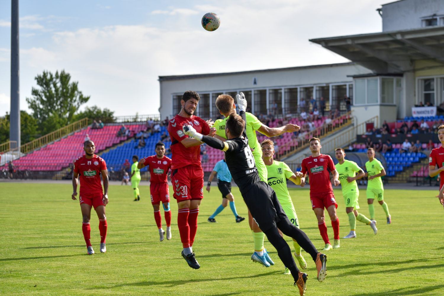 35-ąją mačo minutę panevėžiečiai sukūrė puikią progą prie vilniečių vartų. Jorge Eliasas galva smūgiavo į viršutinį svečių ekipos vartų kampą, bet patikimai sužaidęs „Riterių“ vartininkas Tadas Simaitis šuolyje nukreipė kamuolį į kampinį.