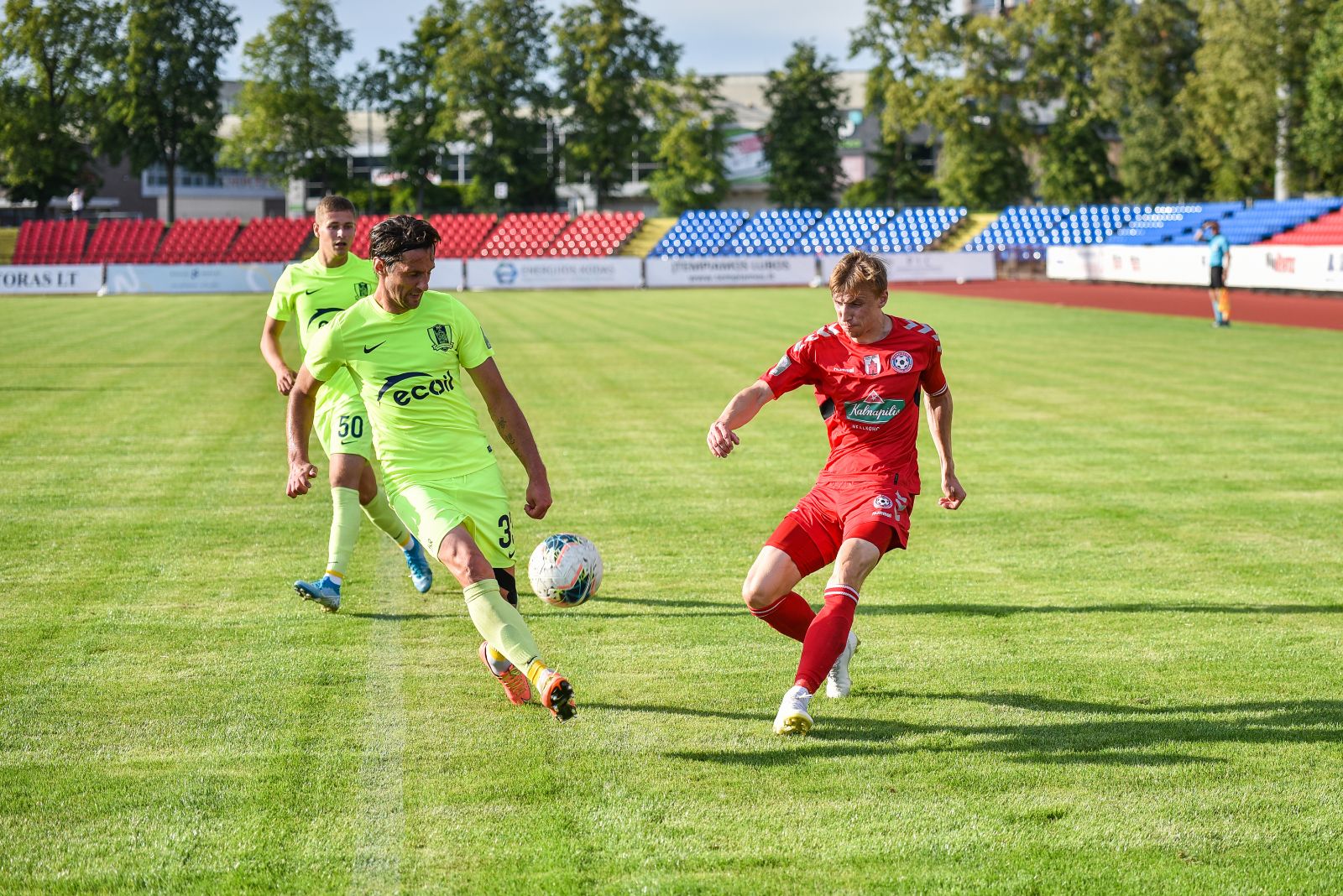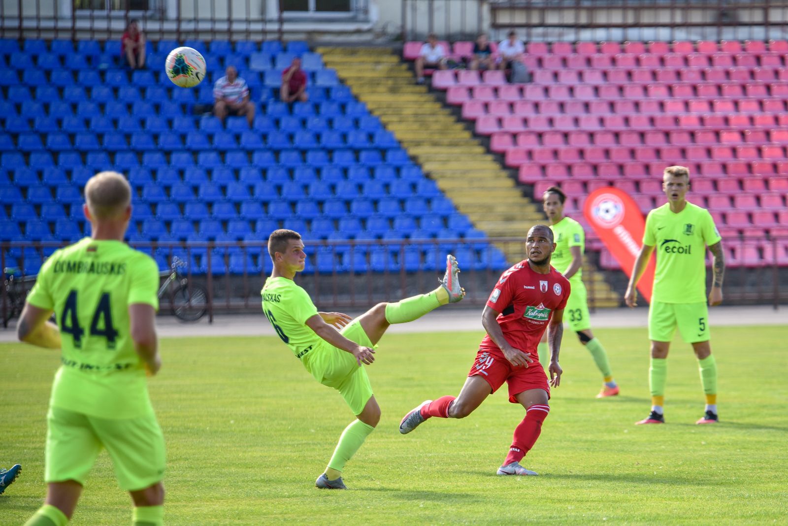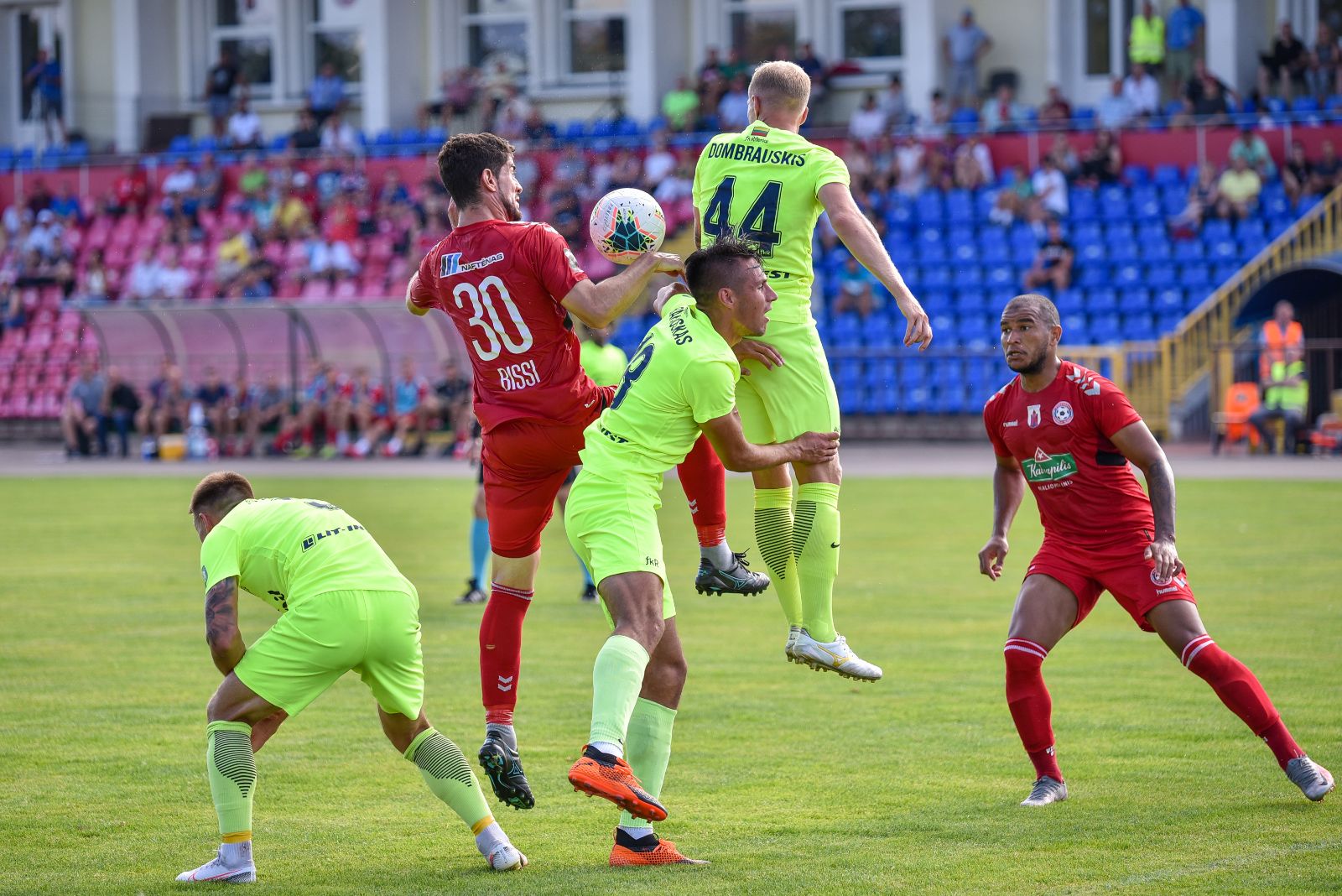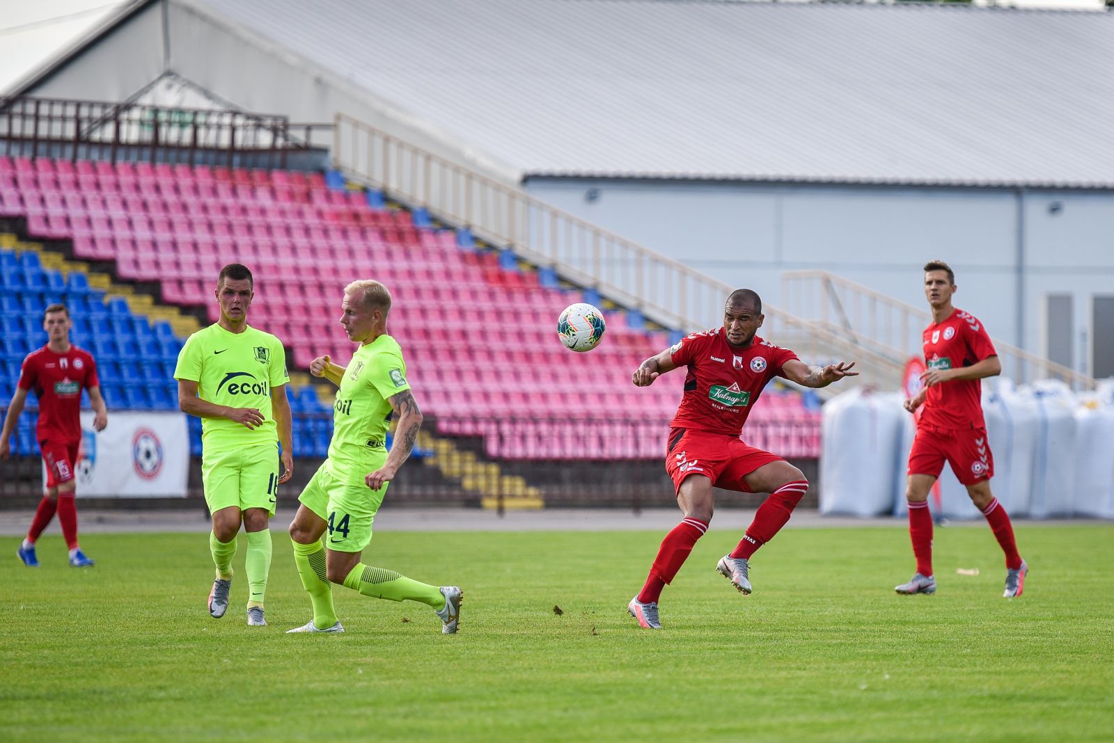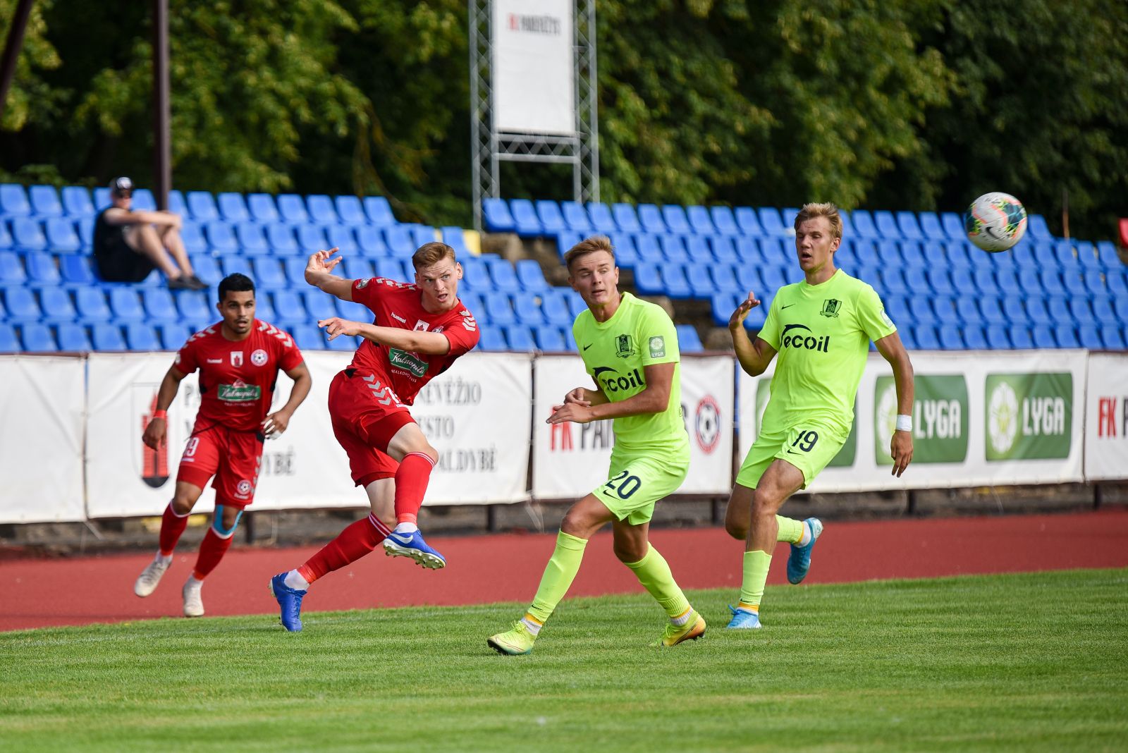35-ąją mačo minutę panevėžiečiai sukūrė puikią progą prie vilniečių vartų. Jorge Eliasas galva smūgiavo į viršutinį svečių ekipos vartų kampą, bet patikimai sužaidęs „Riterių“ vartininkas Tadas Simaitis šuolyje nukreipė kamuolį į kampinį.