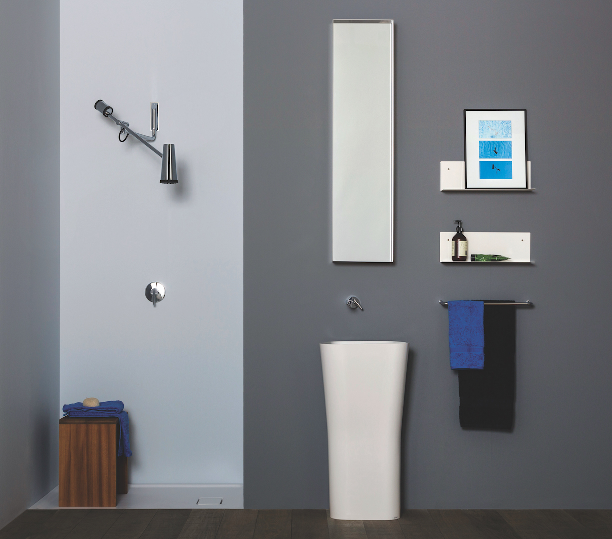 Dabar „Closer“– pilna vonios kambario kolekcija, tačiau atkreipkite dėmesį į sieninį šviestuvą primenantį dušą, nuo kurio viskas ir prasidėjo.