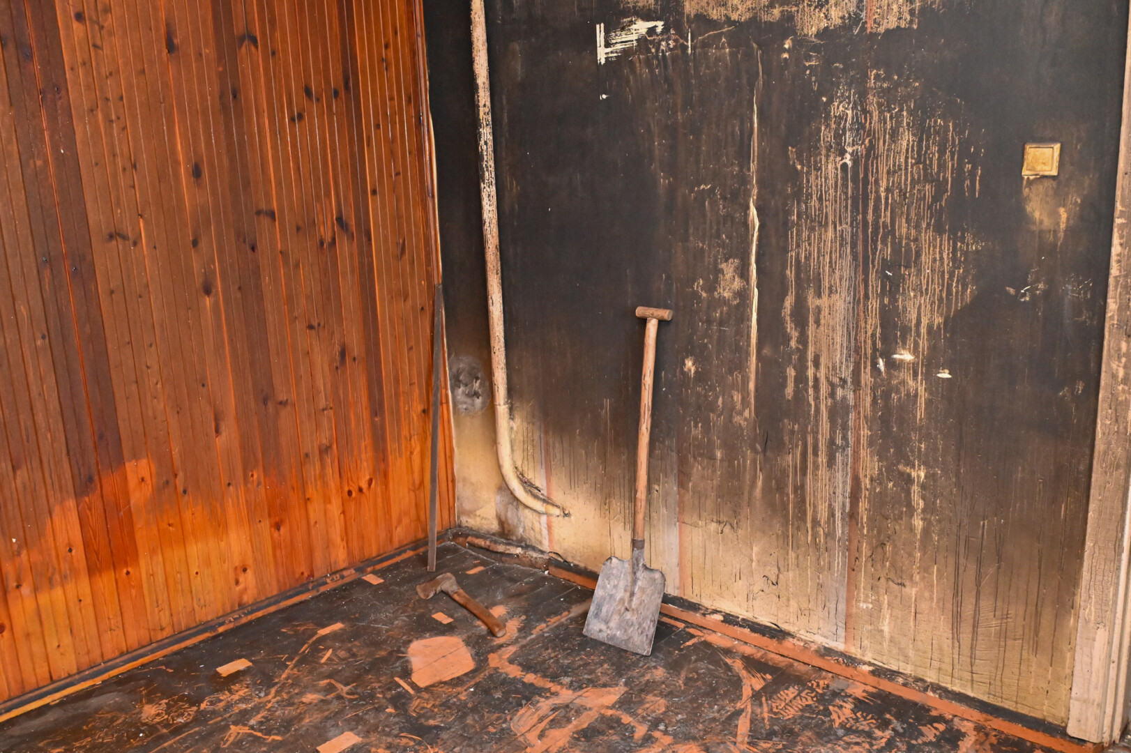 Dabar ugnis suniokojo tik virtuvę, kambarį ir koridorių. Nors dūmų smarvė tvyro visame name, tačiau kiti kambariai liko sveiki ir mama su sūnumi bent turi kur glaustis.