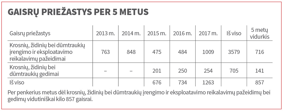 Statistika negailestinga: kasmet dėl neteisingai eksploatuojamų krosnių, židinių ir dūmtraukių ar jų gedimų vidutiniškai kyla 857 gaisrai. Pavyzdžiui, 2015 metais tokių atvejų buvo 676, 2016 metais – 734, o 2017 metais – net 1263. Panašu, kad šiemet bus pasiektas naujas rekordas: jau vien per pirmąjį pusmetį gaisrų skaičius įspūdingas – 985. Palyginti su tuo pačiu laikotarpiu praėjusiais metais, gaisrų skaičius išaugo net 20,7 proc., nes pernai per tą patį laikotarpį užfiksuota 816 gaisrų.