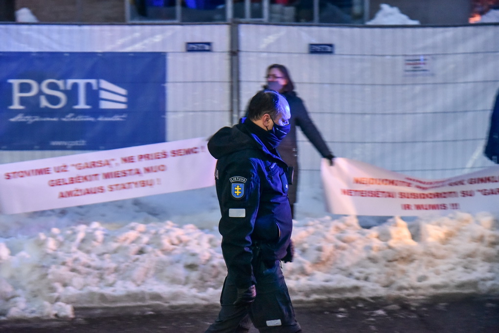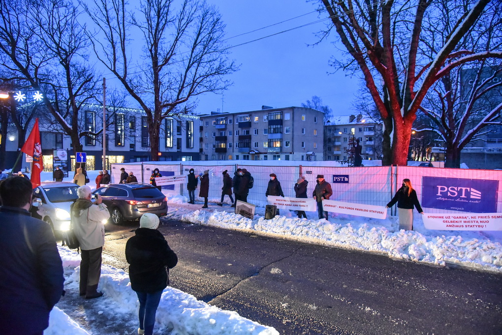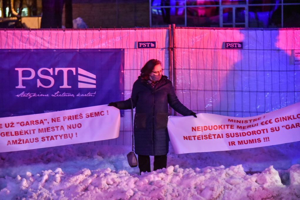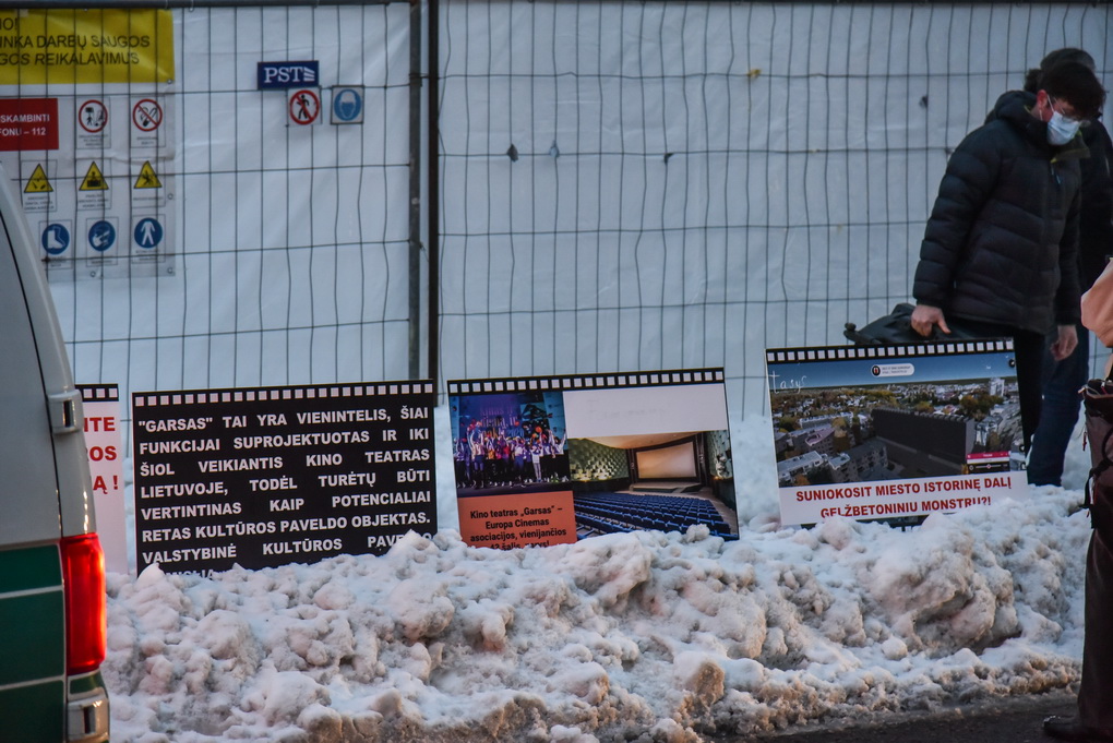Ketvirtadienio vakarą Respublikos gatvėje, prie kino teatrą juosiančios statybinės tvoros buvo matyti per karantiną, kai visi raginami kiek įmanoma vengti kontaktų, retas vaizdas. Būrys žmonių, išsirikiavusių vienoje gatvės pusėje, laikė rankose plakatus, reikalaujančius saugoti, anot jų, kultūros paveldą – „Garso“ pastatą, priešais juos, kitapus gatvės, mindžikavo būrys palaikytojų. Kai kurie jų laikė vėliavas, o sniege pleveno uždegtos žvakutės.