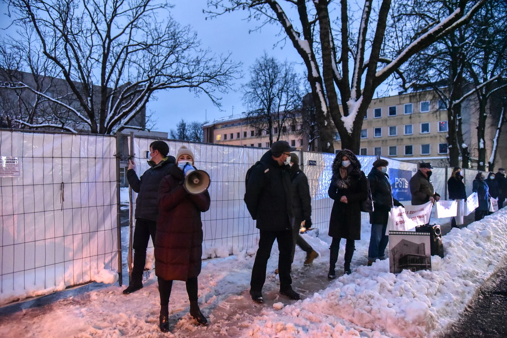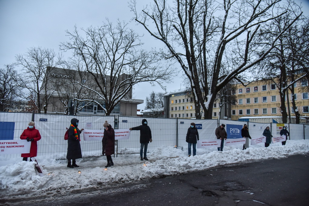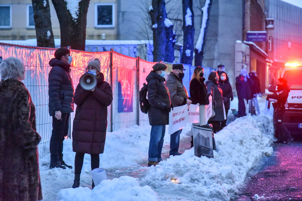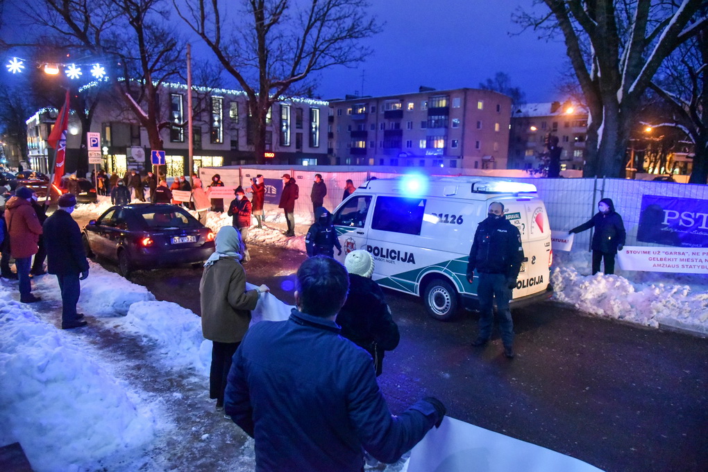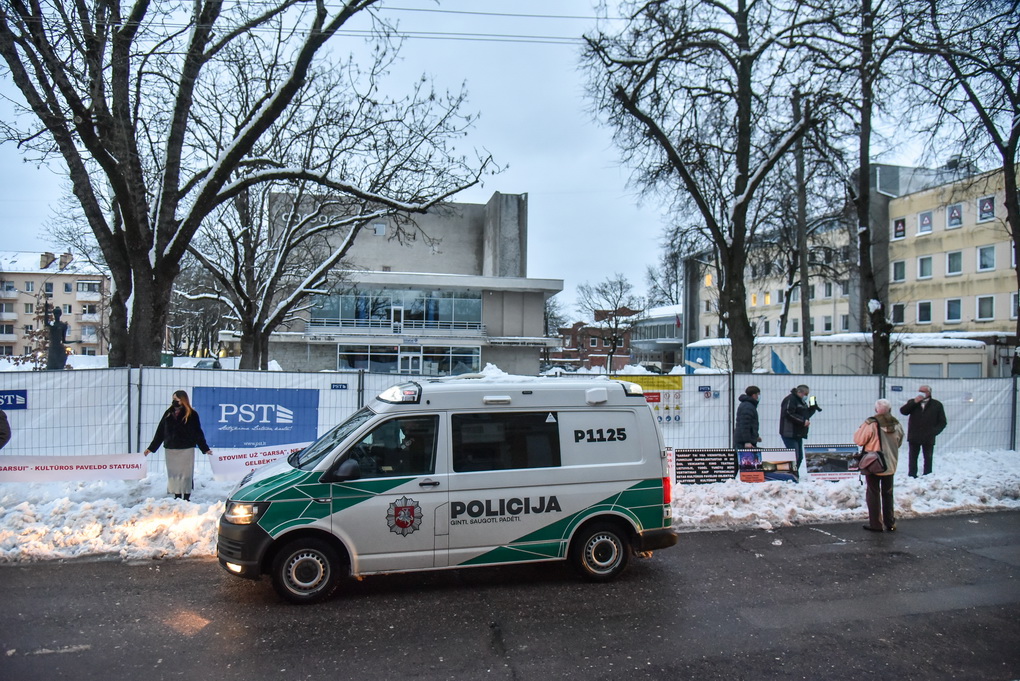 Ketvirtadienio vakarą Respublikos gatvėje, prie kino teatrą juosiančios statybinės tvoros buvo matyti per karantiną, kai visi raginami kiek įmanoma vengti kontaktų, retas vaizdas. Būrys žmonių, išsirikiavusių vienoje gatvės pusėje, laikė rankose plakatus, reikalaujančius saugoti, anot jų, kultūros paveldą – „Garso“ pastatą, priešais juos, kitapus gatvės, mindžikavo būrys palaikytojų. Kai kurie jų laikė vėliavas, o sniege pleveno uždegtos žvakutės.