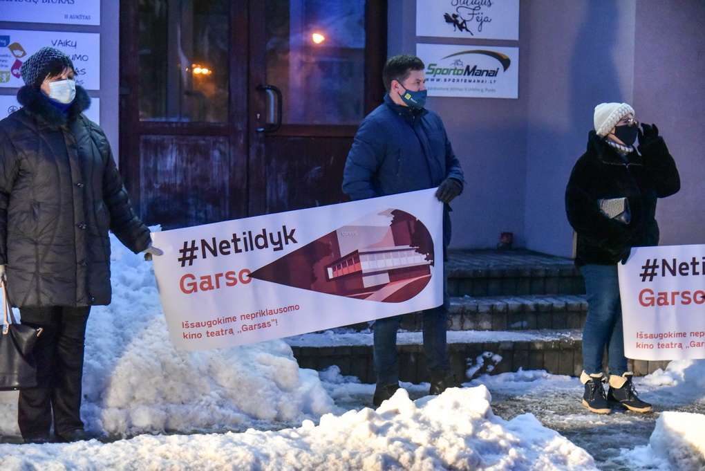 Prieš penkias dešimtis metų statytą kino teatro „Garsas“ pastatą nuo rekonstrukcijos į menų centrą saugantys gynėjai ir pandemijos akivaizdoje rinkosi į piketą, atmetę jiems pasiūlytą alternatyvą – dalyvauti nuotolinėje diskusijoje.