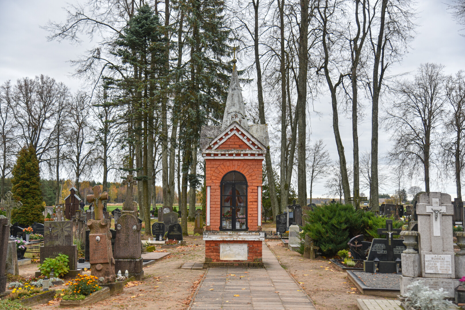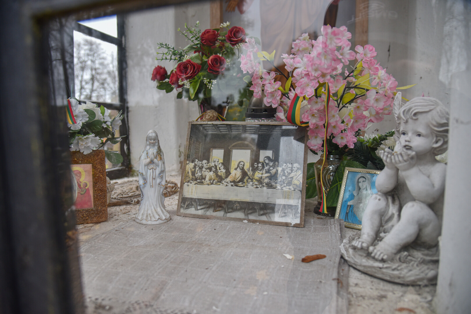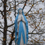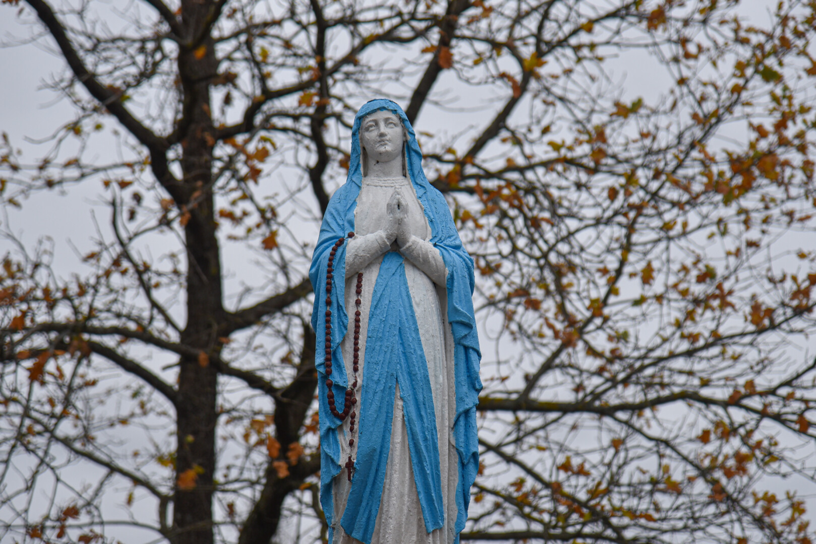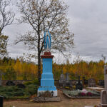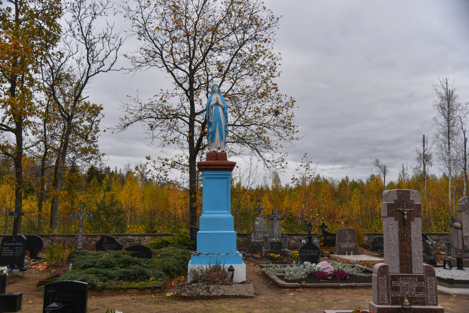 O štai nedidukėse Alančių kapinaitėse Mergelės Marijos statula tikrai stovi. Jos postamentas, o ir Marijos apsiaustas iš tolo šviečia skaisčiai mėlyna spalva.