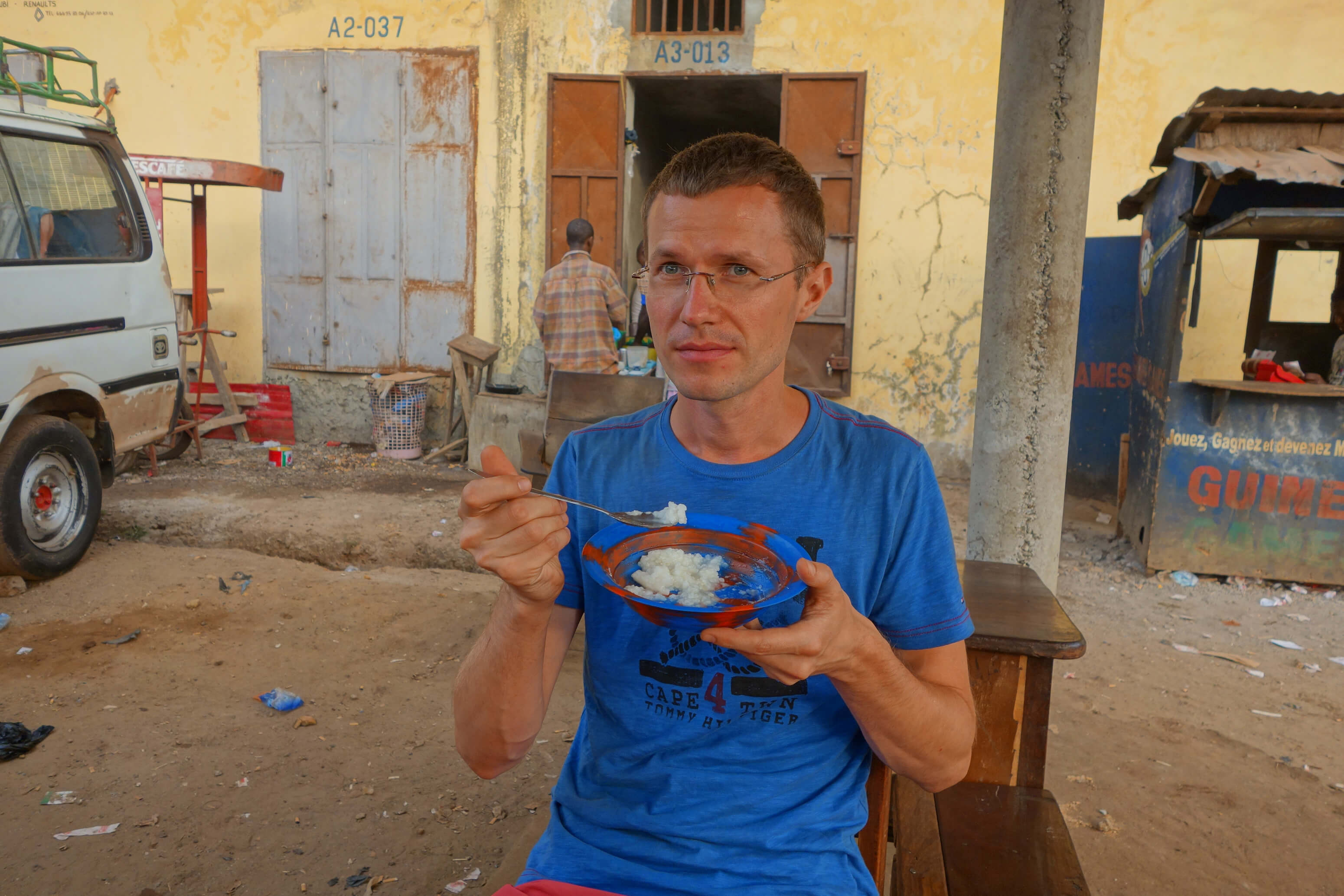 Į Senąją Bisau sostinę Bolamą, kuri yra saloje, nuplaukėme jau temstant. Pirmieji įspūdžiai priminė animacinį filmuką „Mauglis“. Vakare klaidžiojome po džiunglėmis virtusį, žmonių apleistą miestą. Išėję prie vandens radome kaimelį su tradicinėmis afrikietiškomis trobelėmis. Šis miestas pastatytas kolonistams portugalams jau pasitraukus. Afrikiečiai daug ką bandė daryti savaip, įkūrė naują miestą Bisau, tad dabar šalis ir vadinasi Bisau Gvinėja. Šalies administraciją perkėlus į Bisau, ilgainiui Bolamos reikšmė sumenko. Klajonė po šį apleistą miestą, vakaro šešėliai, baimės jausmas – viskas iki šiol paliko stiprų įspūdį.