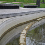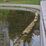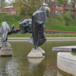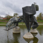Dargi atkreipęs dėmesį, kad pievelėje netoli vėžio skulptūros žydintys narcizai apsemti vandens.