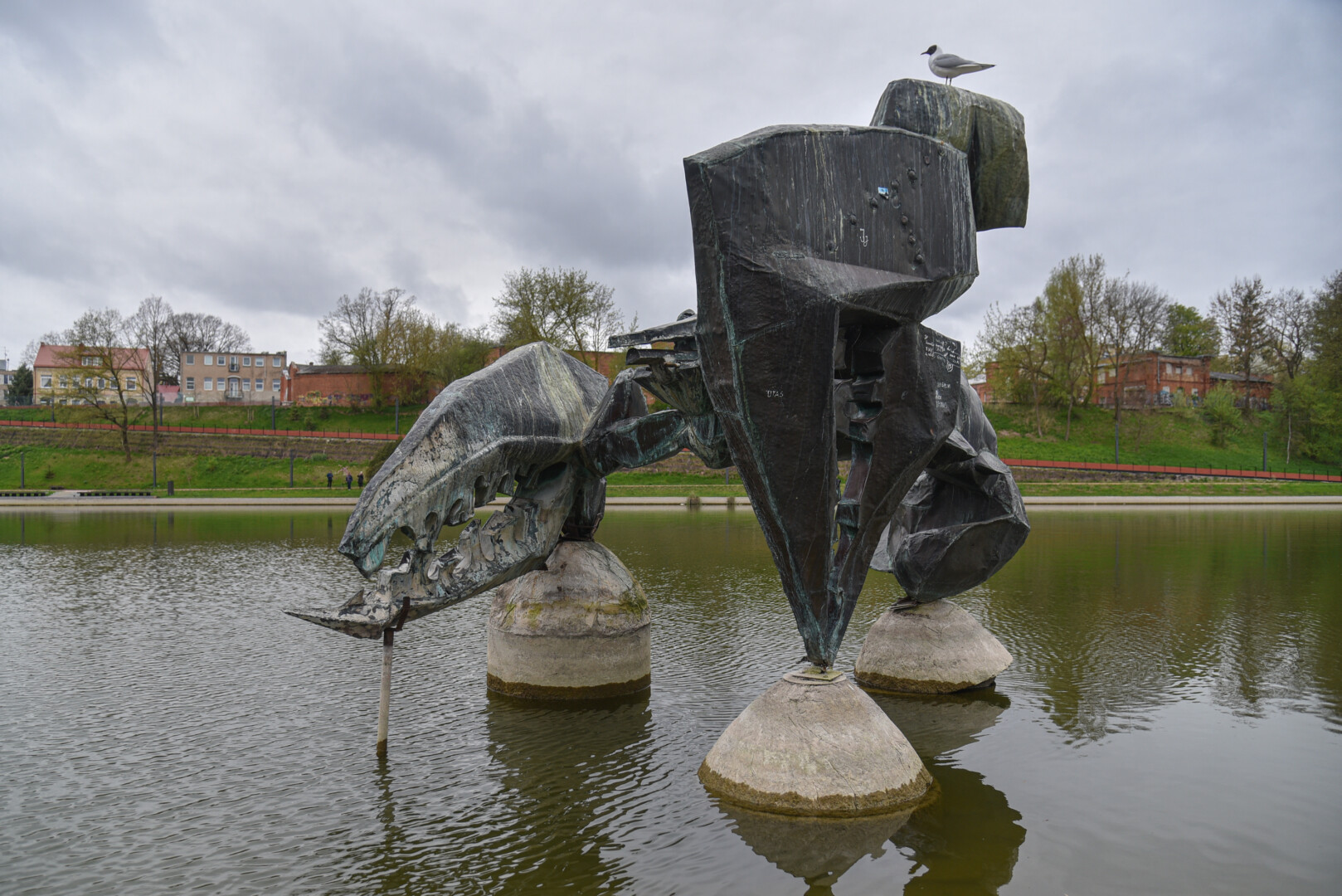 Dargi atkreipęs dėmesį, kad pievelėje netoli vėžio skulptūros žydintys narcizai apsemti vandens.
