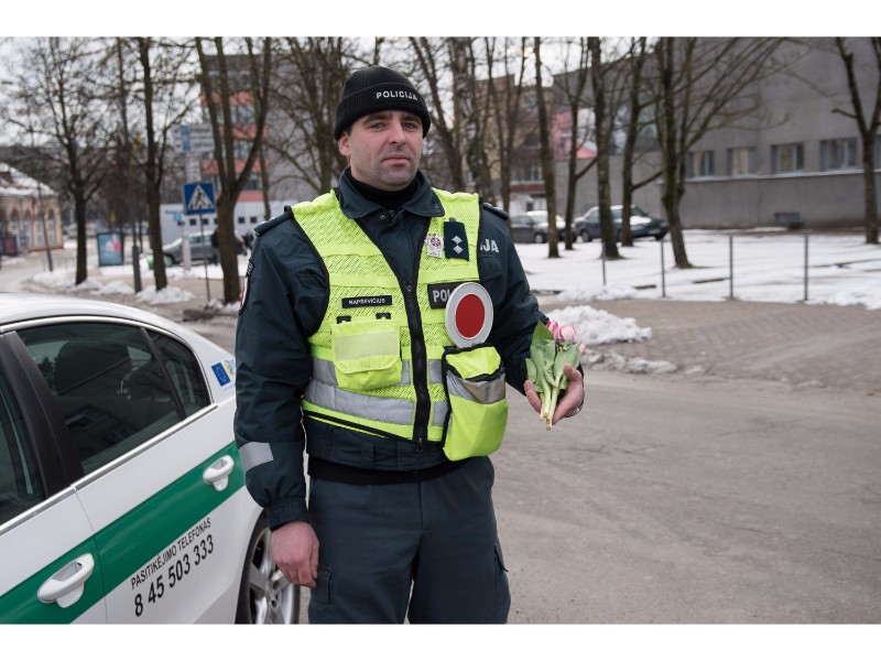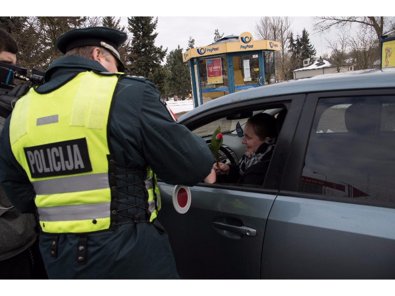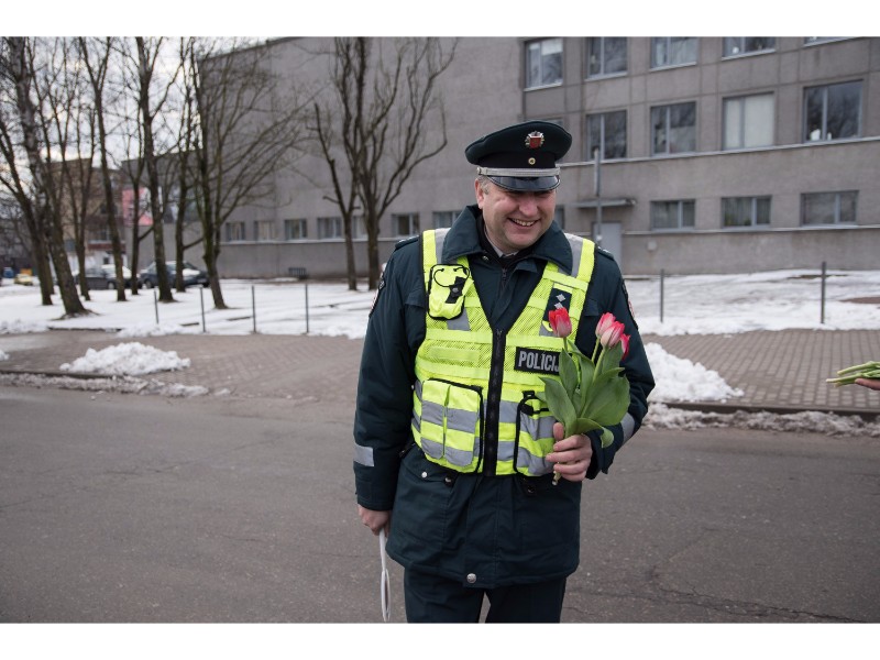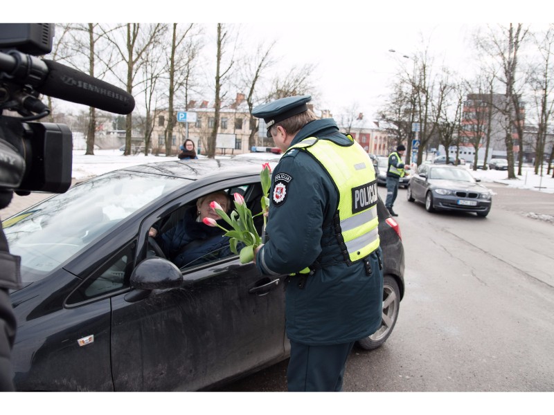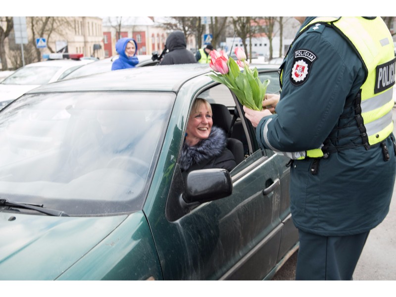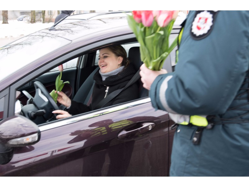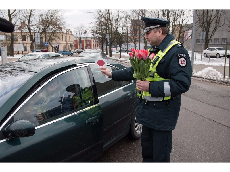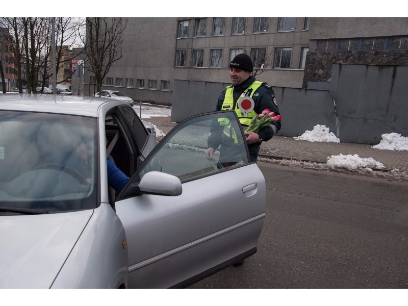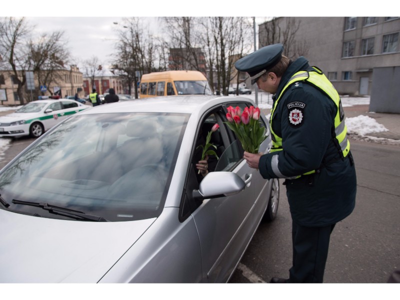 Policininkų iškelta lazdelė moterų širdis šiandien privertė plakti tankiau. Tačiau prie automobilio priėjusius pareigūnus vairuotojos pasitikdavo su šypsena, kuomet jų rankose išvysdavo tulpių žiedus.