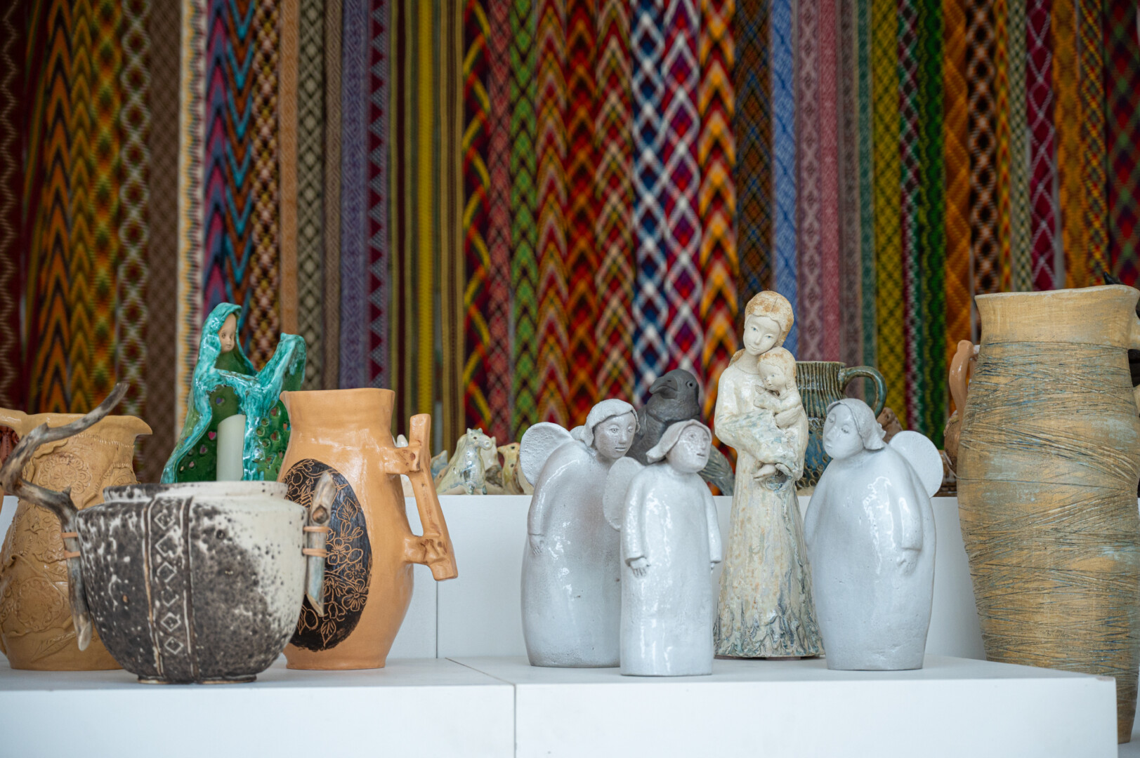 Viena keramikos paviljono siena mirga pintų bei austų tautinių juostų raštais.