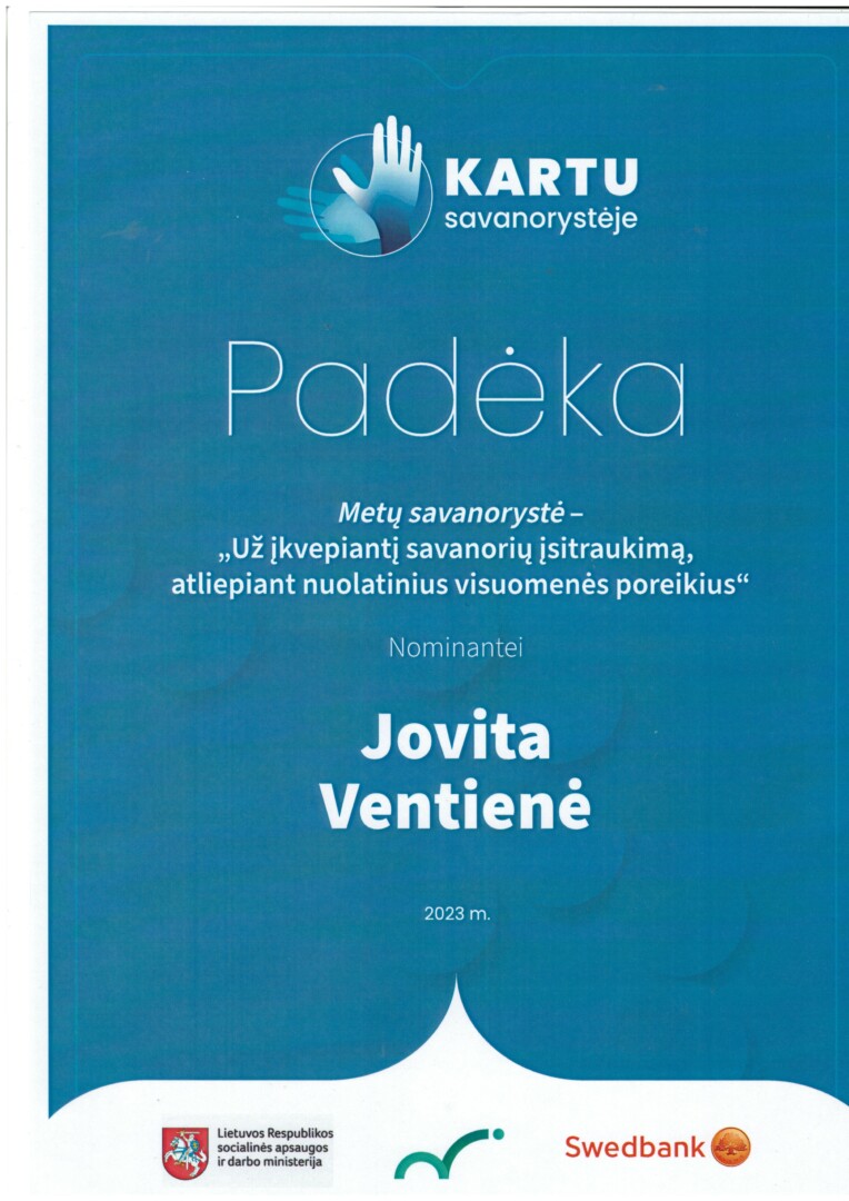 Ir jau po metų Jovita įsidarbino socialine darbuotoja Panevėžio rajone.