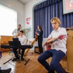 Vidurdienį jubiliejaus šventė prasidėjo Kristaus Karaliaus katedroje, kur vyskupas Linas Vodopjanovas kartu su trimis kunigais laikė šv. Mišias. Du iš kunigų – Berčiūnų Lietuvos kankinių bažnyčios rektorius Algirdas Dauknys ir Lietuvos kariuomenės Karinių oro pajėgų kapelionas pulkininkas leitenantas Virginijus Veilentas – buvę tuometinės Panevėžio 5-osios vidurinės mokyklos auklėtiniai. Troškūnų šv. Trejybės parapijos klebonas Saulius Filipavičius – pirmasis mokyklos tikybos mokytojas, šaliai atkūrus nepriklausomybę.