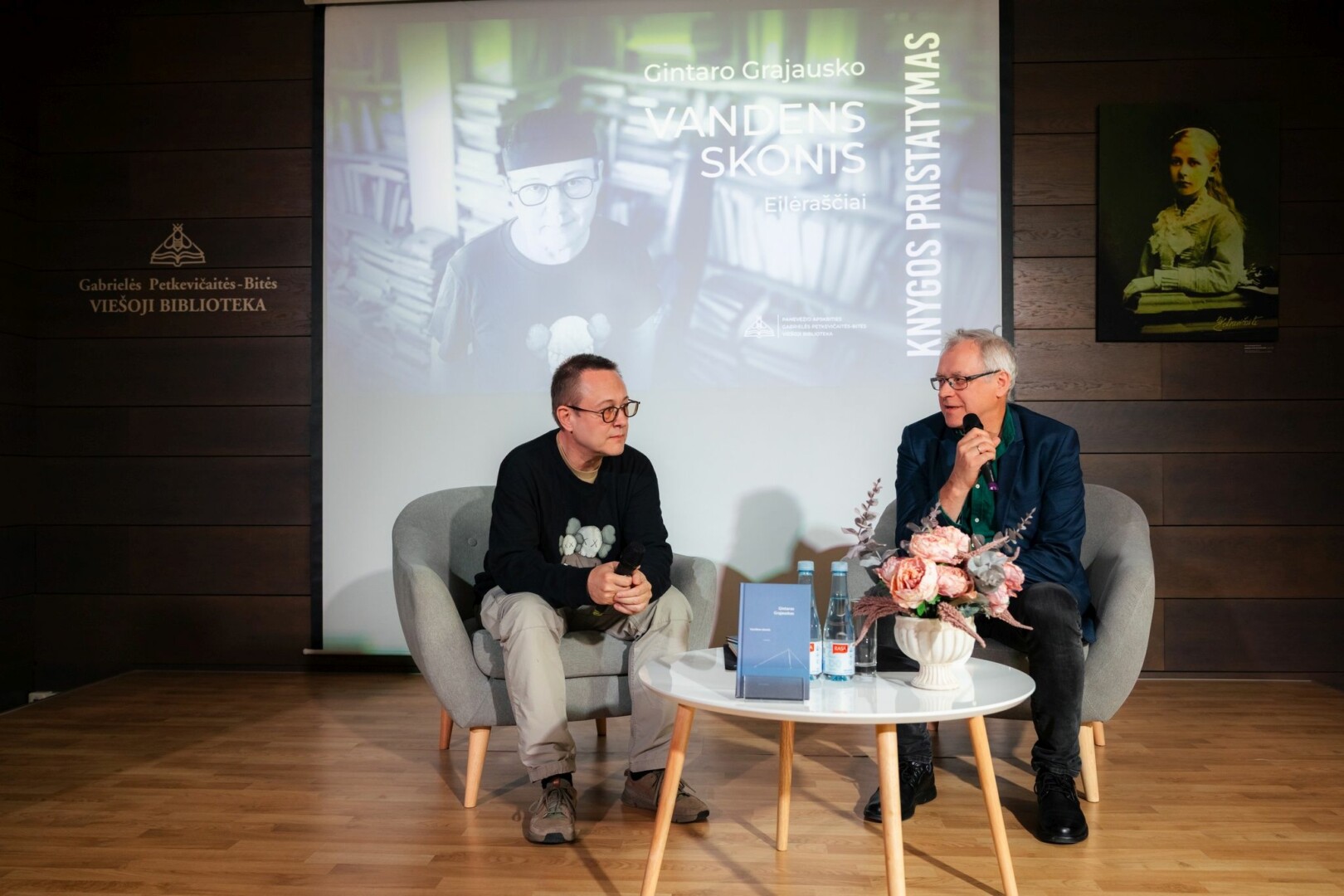 Panevėžio apskrities Gabrielės Petkevičaitės-Bitės viešojoje bibliotekoje pristatyta naujausia poeto, prozininko, vertėjo, dramaturgo, Klaipėdos dramos teatro meno vadovo Gintaro Grajausko poezijos knyga „Vandens skonis“.