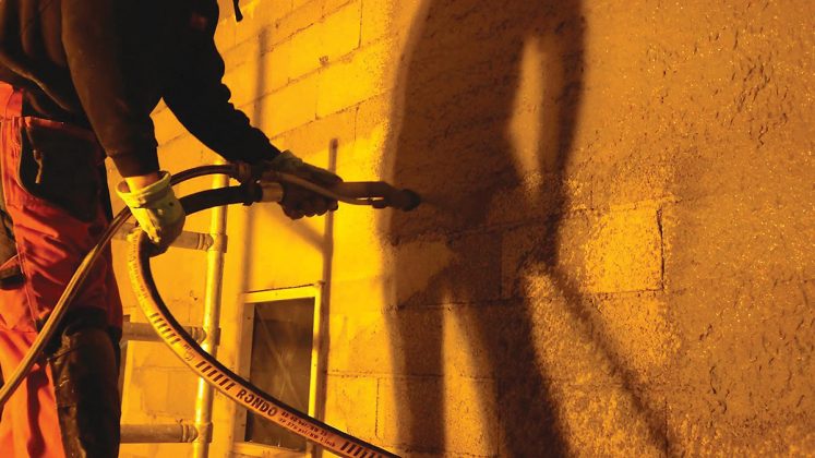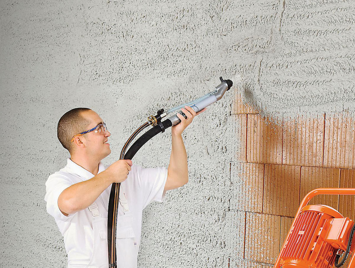 Tinko skiedinys, iš mašinos išmestas su didele jėga, patikimiau prilimpa prie pagrindo nei uždrebiamas mentele. PFT nuotr.