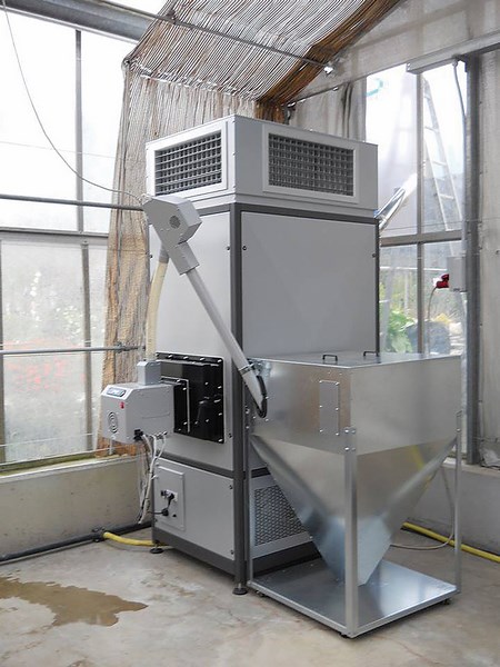 Komplekte yra karšto oro generatorius, degiklis, granulių talpykla ir granulių įkrovos sistema.