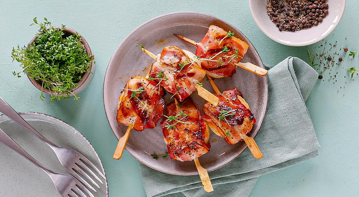 Kiekvieną bulvės skiltelę įvyniokite į šoninės gabalėlį, apskrudinkite grilyje iš visų pusių iki traškios plutelės, pabarstykite pipirais ir patiekite.
