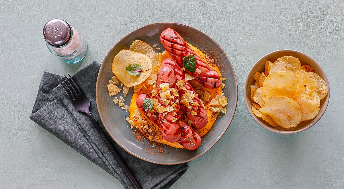 Reikės (4 porcijoms): 4 virtų dešrelių, 80 g bulvių traškučių, 80 g sūrio padažo.