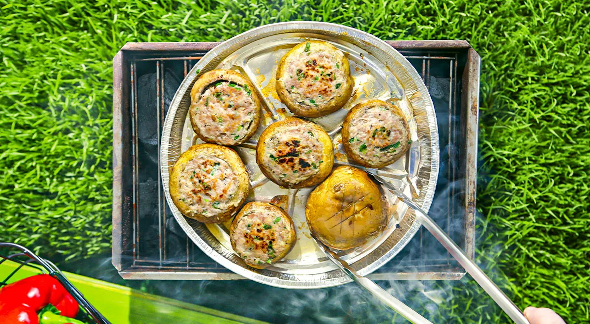 Įkaitinkite grilyje anglis. Grilio groteles uždenkite aliejumi sutepta folija. Ant jos išdėliokite grybus faršu žemyn. Uždenkite kitu folijos lakštu ir kepkite 10 minučių. Tada nuimkite viršutinę foliją, apverskite grybus ir kepkite dar 7–8 minutes. Baigę išdėliokite į lėkštes ir patiekite su karštomis daržovėmis bei žalumynais.