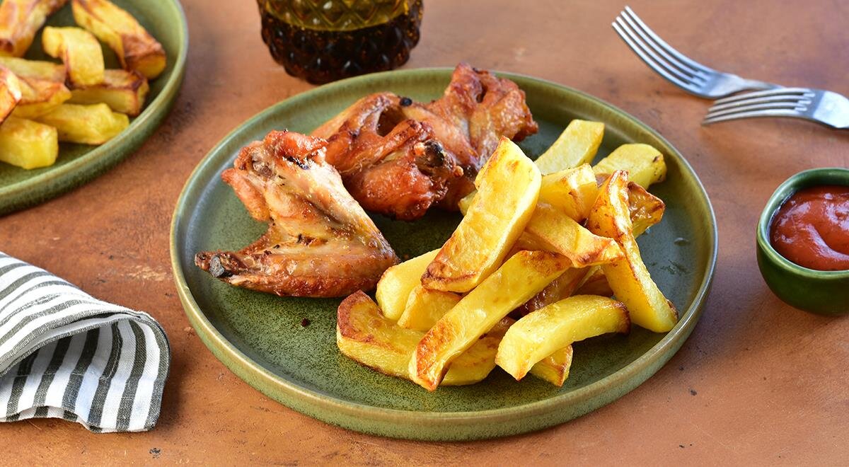 Orkaitėje gruzdintos bulvytės su viščiukų sparneliais