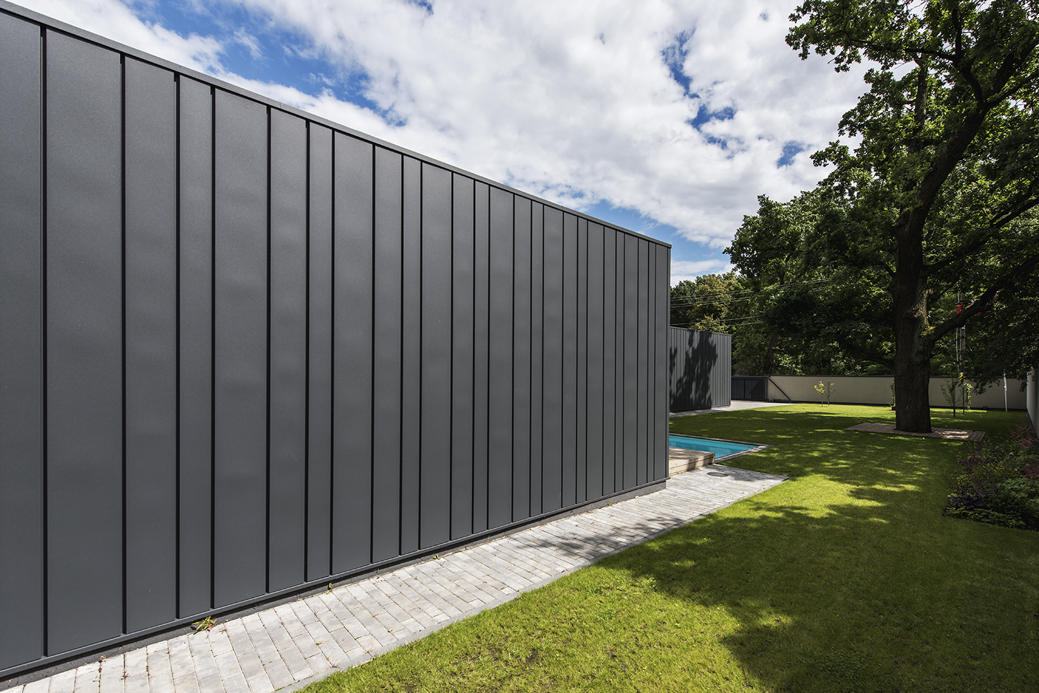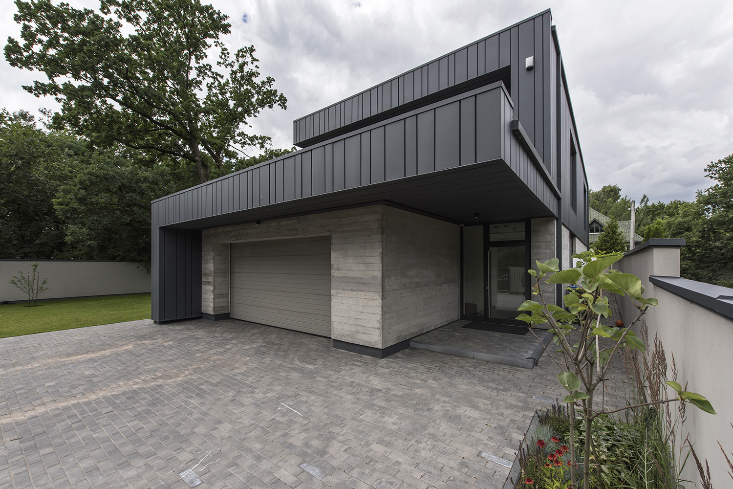 Pastato apdailai nuspręsta pasirinkti dvi iš pirmo žvilgsnio agresyviai atrodančias medžiagas: betoną ir skardą. Juodos skardos apdailą pagyvina lankstinio raštas, sukuriantis nevienodo pločio lentomis apkalto fasado įspūdį. Betono apdaila – primiršta klasika. „Po betonu yra šiltinimo sluoksniai, o medžio klojinių raštas suteikia šilumos ir dekoratyvumo. Tai ilgaamžė medžiaga. Jeigu atsirastų samanėlių, jį lengva nuplauti, nors tai gal kaip tik namui suteiktų papildomo grožio“, – svarsto architektai.