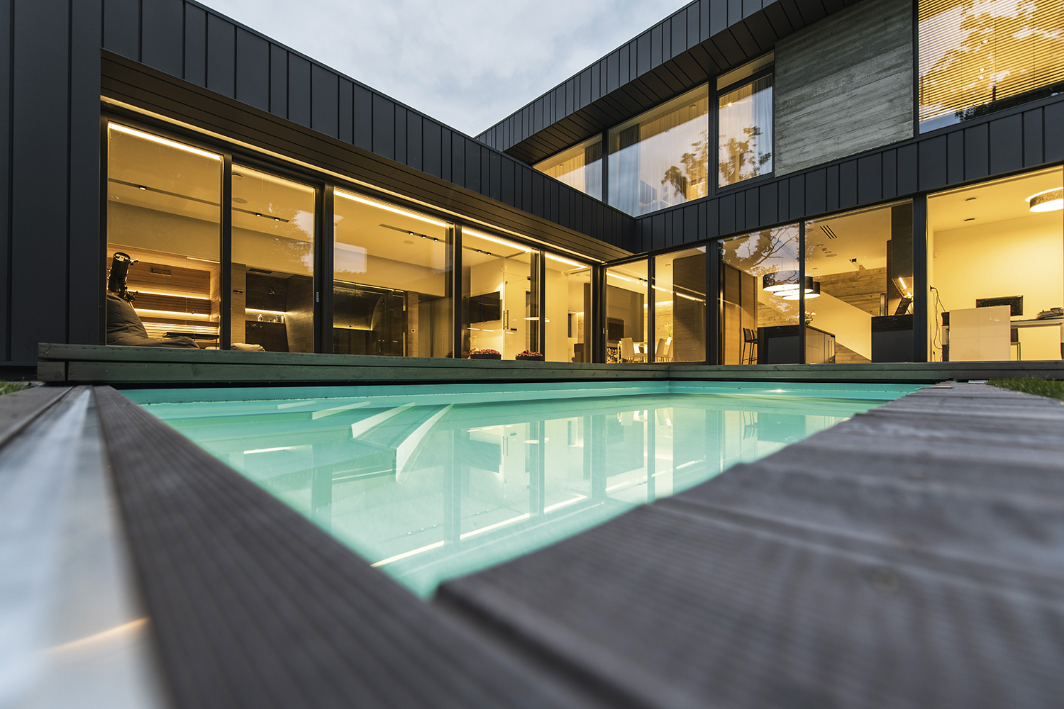 Aplink baseiną einanti terasa vienija pirmame aukšte esančią priepirčio zoną, svetainę, valgomąjį, darbo kabinetą ir šalia garažo įkurtą dirbtuvėlių zoną. Taip suformuojamas jaukus vidinis kiemelis.