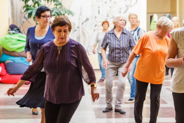 Pastarųjų judesių senjorus moko kone pati vyriausia organizacijos dėstytoja Violeta Krasauskienė, kuri pati vis dar šoka Panevėžio bendruomenių rūmuose. Labai smagu matyti, kaip judri septintą dešimtį perkopusi moteris į salę atsineša modernų nešiojamąjį grotuvą su USB atmintuku ir savo šokėjams paleidžia lotynų Amerikos melodijas. Pagal muziką studentės iš lėto skaičiuoja žingsnelius ir įsilieja į bendrą šokį.