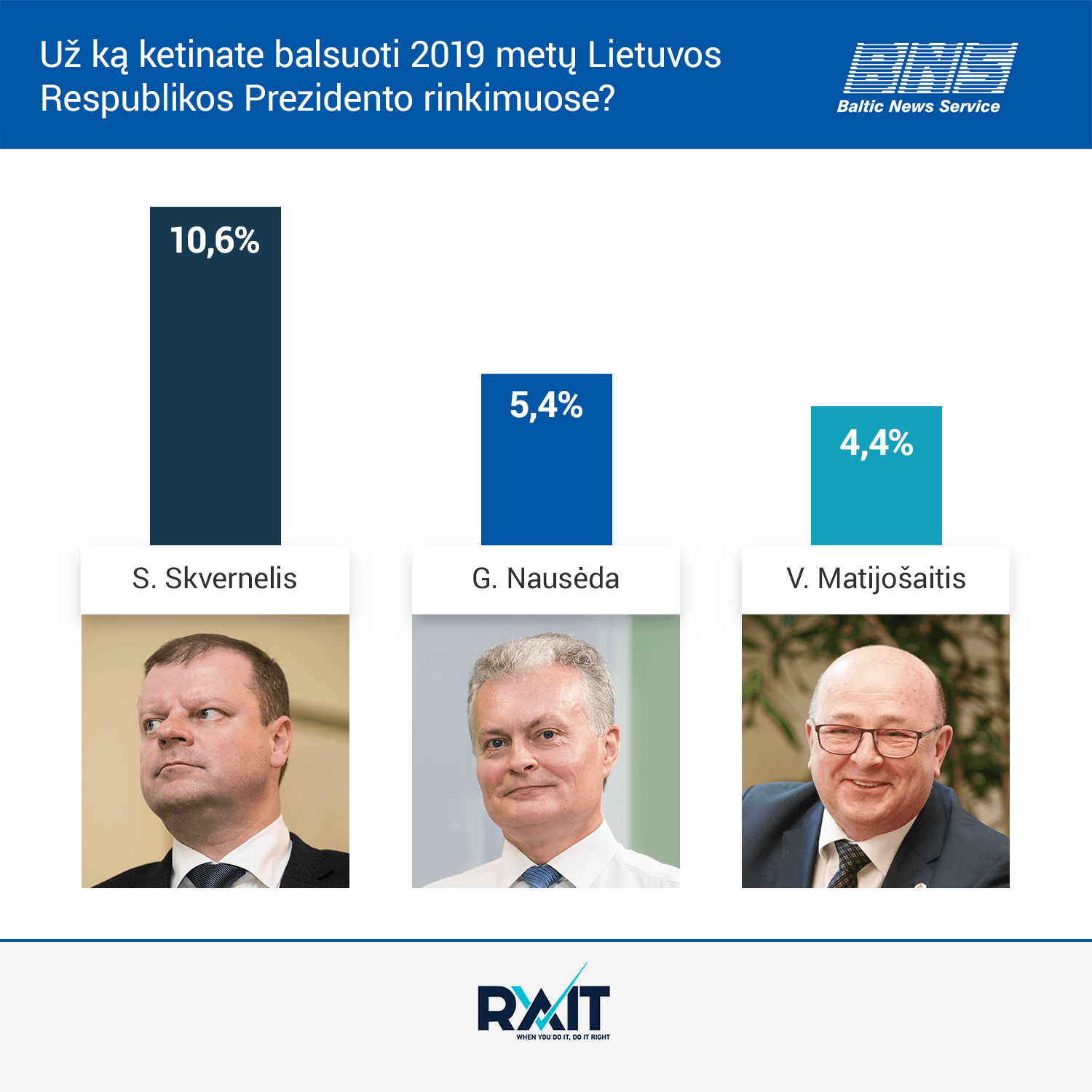 SEB banko ekonomistą G. Nausėdą pasirinko 5,4 proc. apklaustųjų, Kauno merą V. Matijošaitį – 4,4 proc. respondentų. Beveik pusė apklausos dalyvių (49 proc.) sakė nežinantys, už ką balsuotų, arba neatsakė į klausimą. Nė vienas iš lyderių trejetuko kol kas nėra paskelbęs, kad sieks tapti Dalios Grybauskaitės įpėdiniu.