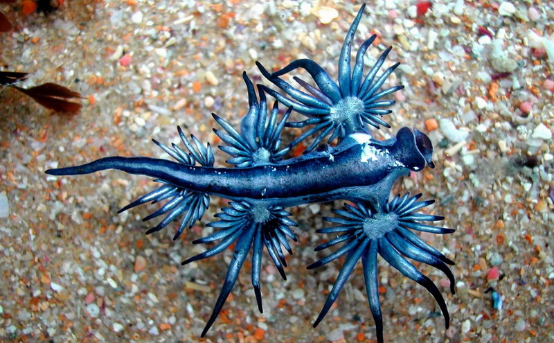 Šie gyviai ypatingi tuo, kad ėda gyvus padarus ir ne mažus, o didelius, pavyzdžiui, medūzas. Be to, jie nevengia maitintis ir savo rūšies atstovais. Kitaip tariant, yra mažieji kanibalai. Įdomu ir tai, kad mėlynieji drakonai plaukioja vandens paviršiuje, kur išsilaikyti jiems padeda prarytas oro burbulas. Taip pat labai neįprasta jų forma – ar jis su plaukmenimis, ar su pirštuotomis letenomis? Vis dėlto keistas šio gyvio „šarvas“ padeda jam medžioti aukas. Mėlynieji drakonai gali užaugti iki 4–5 cm ir gyvena tropinių pasaulio kraštų vandenyse.