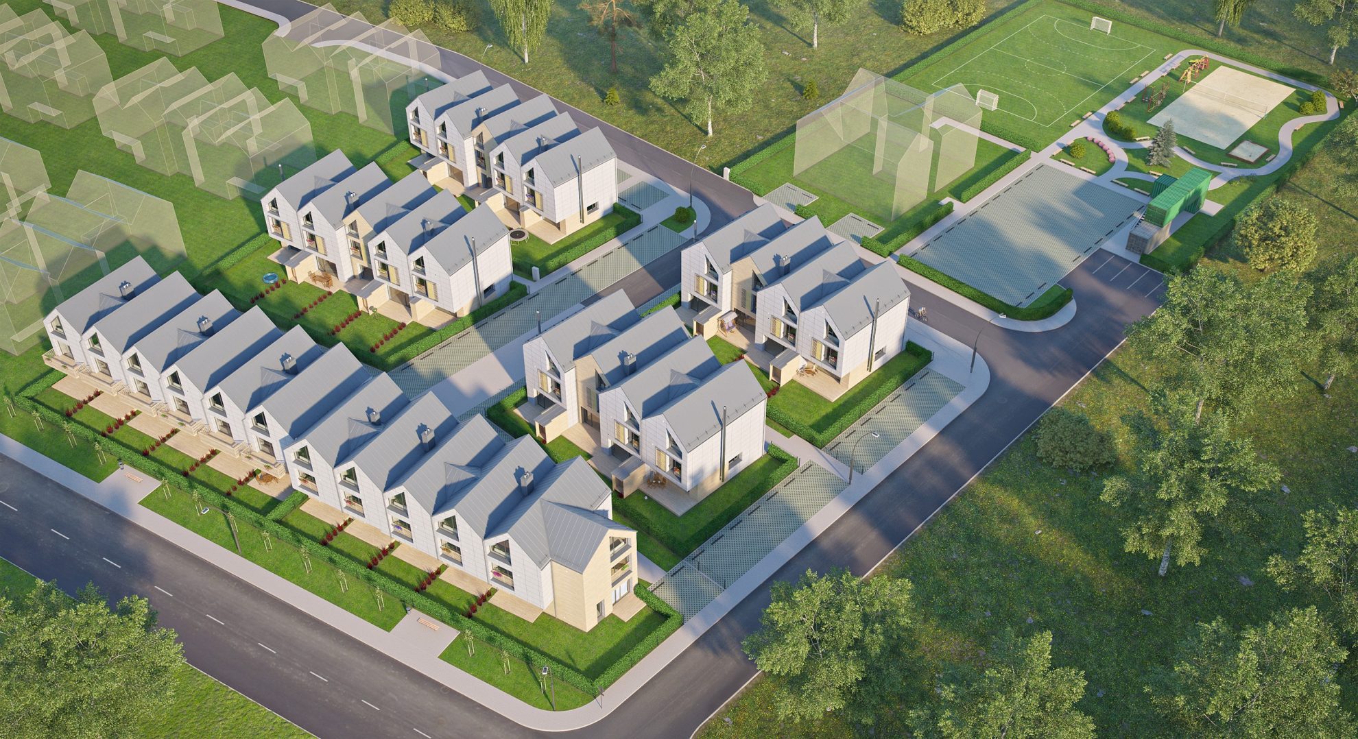 Apsėta žolė, aptverta tvora, išklotos trinkelės, įrengtos automobilių stovėjimo vietos (kiekvienam kotedžui po dvi), pasodintos gyvatvorės ir medeliai, pastatytos skulptūros; įrengta poilsio, sporto ir žaidimų zona.