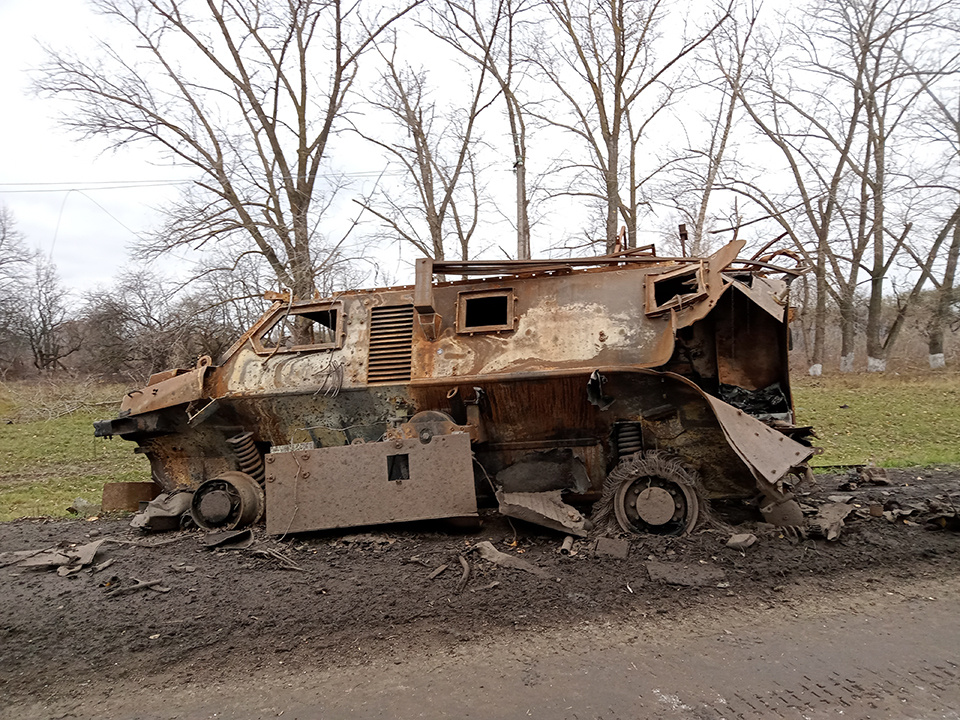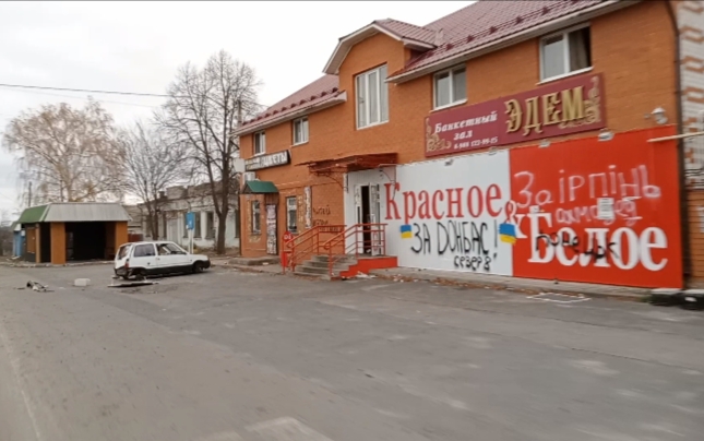 Paskutinėje didesnėje Ukrainos pasienio gyvenvietėje Junakivkoje vaizdas labai niūrus – sugriauta mokykla ir cerkvė, keliai vos išvažiuojami per duobes, likusias po bombardavimų.