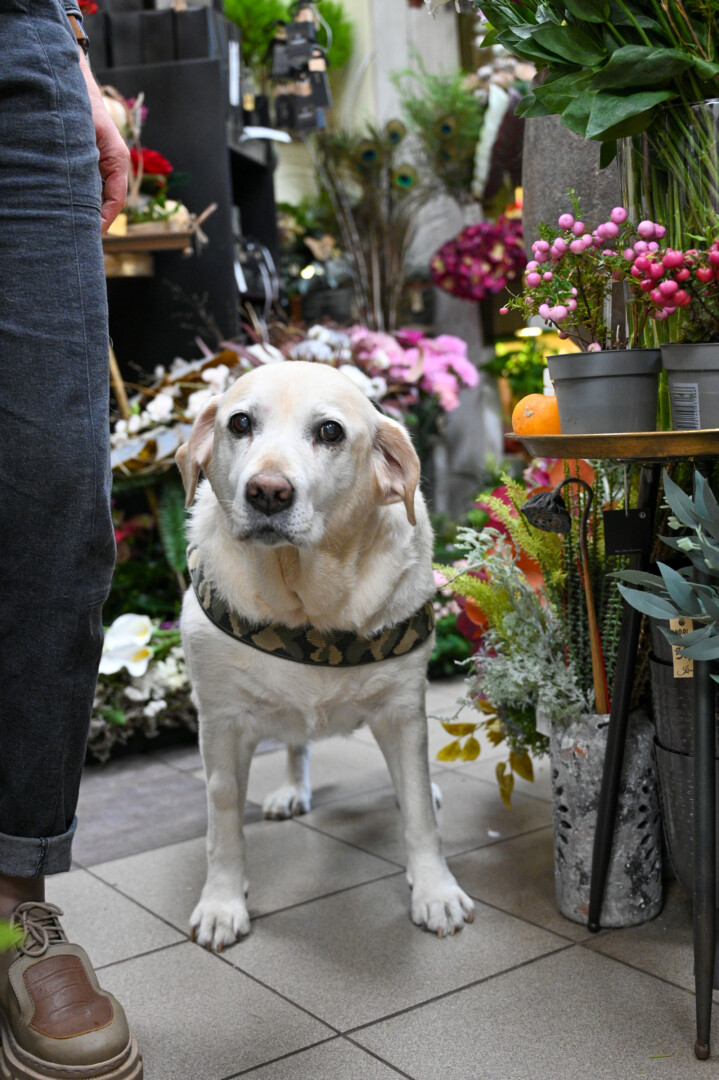 Jau ketverius metus kasdien į darbą gėlių salone keliauja ir auksaspalvė labradorė Lora.