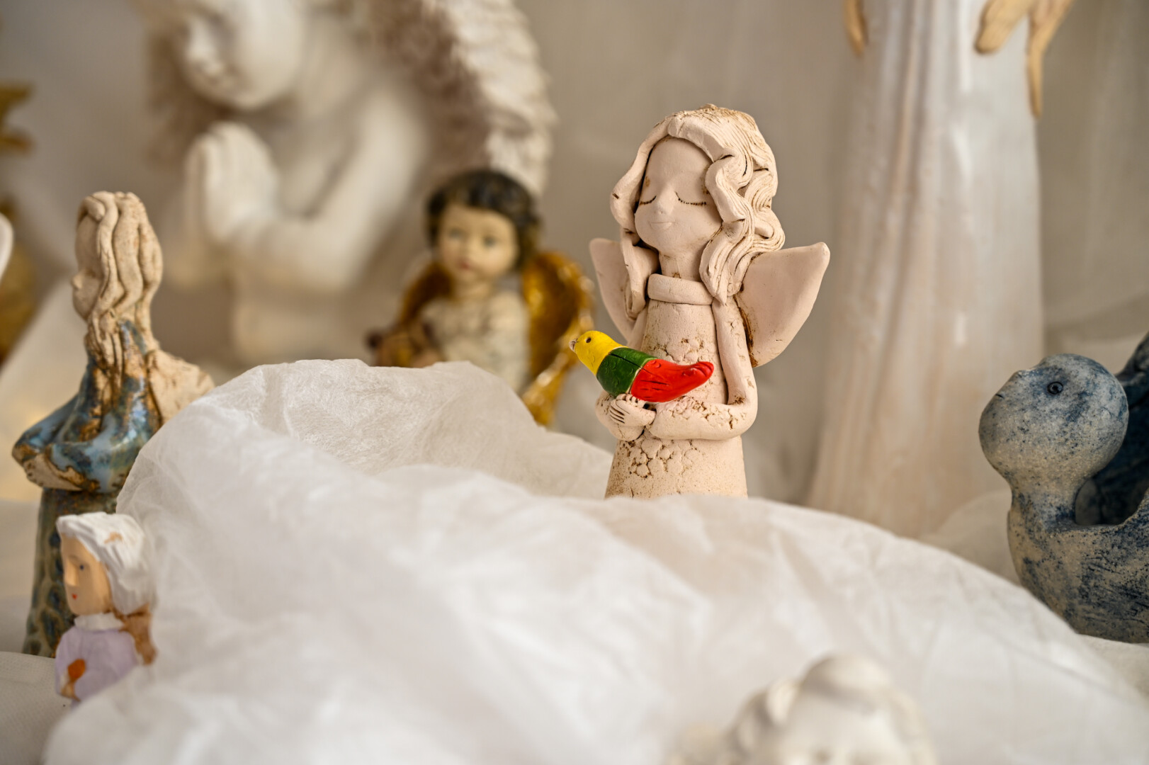 Parodoje eksponuojami patys įvairiausi angelai – nuo mažiukų, nedaug sveriančių, iki nemenkų, sunkių. Yra medinių, šamotinių, gamintų iš stiklo, keraminių. Greta jų – ir angelai-žvakės ar angelai-žvakidės, taip pat angelai su trispalvėmis.