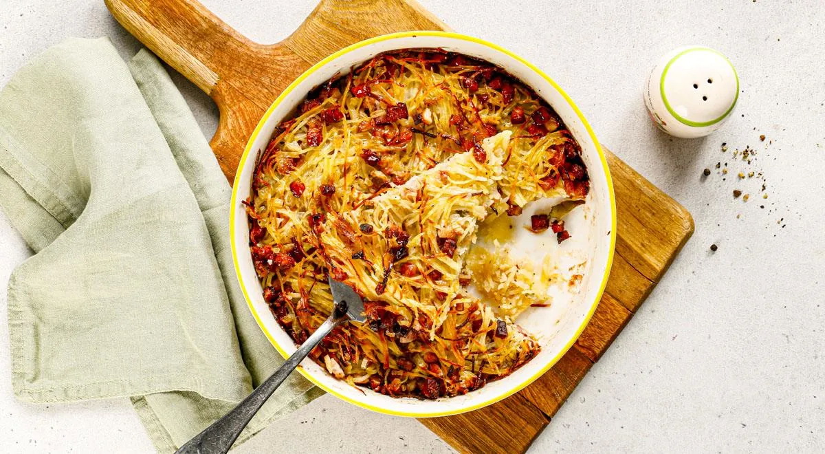 Reikės (6 porcijoms): 600 g bulvių, 2 kiaušinių baltymų, 35 g sviesto, druskos, šviežiai maltų juodųjų pipirų; įdarui: 250 g šoninės, 1 raudonos paprikos, 1 raudonojo svogūno, 100 g kietojo tūrio, 2 kiaušinių trynių, 2 šaukštų pusriebės grietinėlės, 1 šaukšto aliejaus.