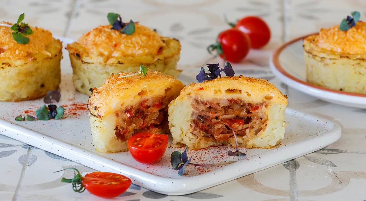 Bulviniai keksiukai su šonine, kiaušiniais ir daržovėmis