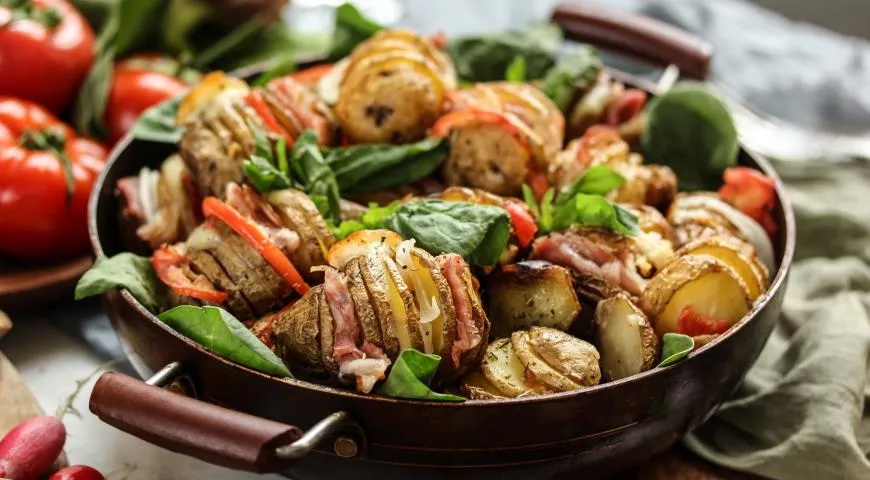 Reikės (4 porcijoms): 8 bulvių, 3 pomidorų, 2 svogūnų, 150 g šoninės, 100 g kietojo sūrio, 60 g sviesto, 4 šaukštų saulėgrąžų aliejaus, 3 česnako skiltelių, druskos, šviežiai maltų juodųjų pipirų, špinatų lapelių – patiekti.