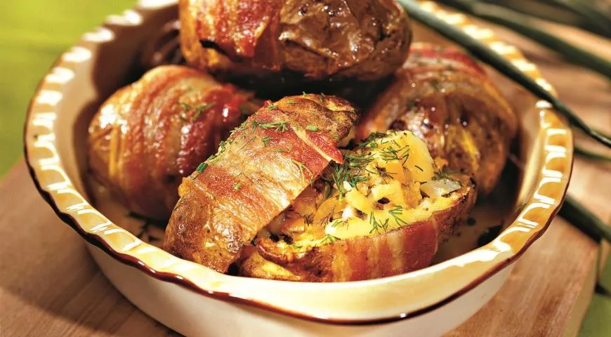 Reikės (4 porcijoms): 8 šviežių bulvių, 8 juostelių šaltai rūkytos šoninės, 60 g puskiečio sūrio, 50 g sviesto, 1 česnako skiltelės, šviežiai maltų juodųjų pipirų, druskos.