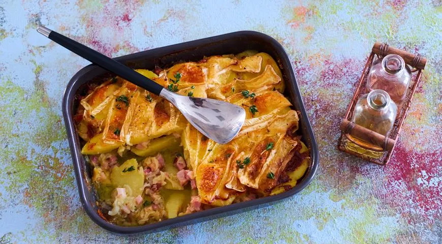 Reikės (4 porcijoms): 600 g bulvių, 300 g „Reblochon“, bri arba kamambero sūrio, 2 didelių svogūnų, 200 g rūkytos šoninės, 60 ml sauso baltojo vyno, 4–5 česnako skiltelių, 4–5 čiobrelių šakelių, sviesto, druskos, šviežiai maltų juodųjų pipirų.