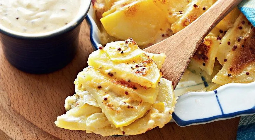 Reikės (4 porcijoms): 1 kg bulvių, 430 ml pusriebės grietinėlės, 2 porų, 250 g rūkytos šoninės, 150 g čederio sūrio, 2 šaukštų grūdėtųjų garstyčių.
