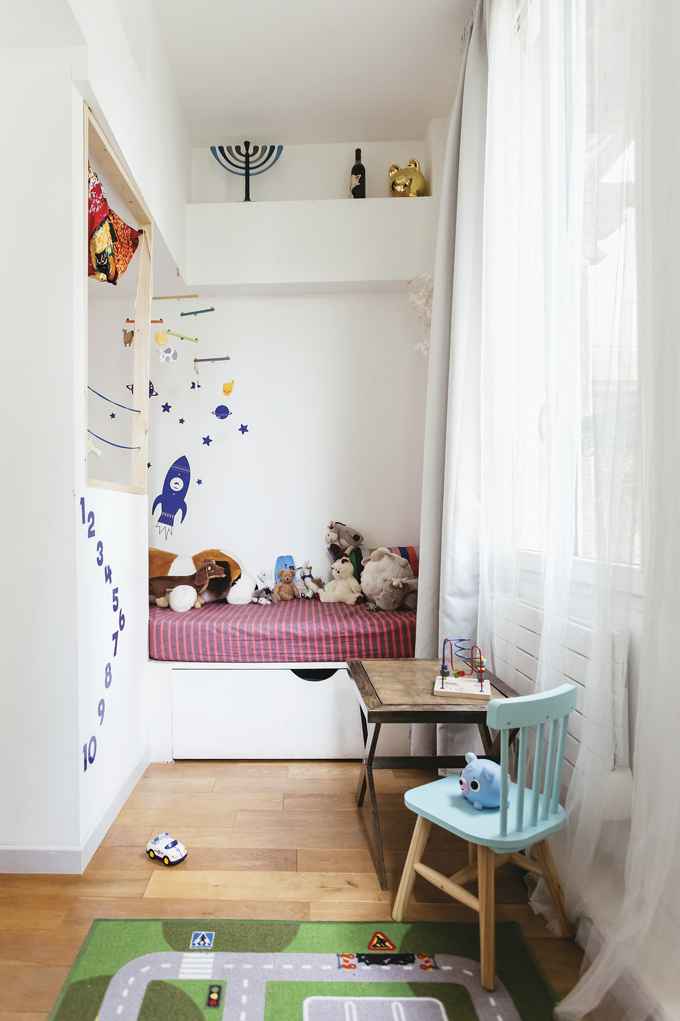 Vaiko kambarys. Oskaras nuo pat gimimo miegodavo ne lopšeliuose, o didelėse lovose. Šiame kambaryje jo lova integruota į kitus baldus, čiužinys išpjautas specialiai. O šalia įrengta pakyla, tarsi maža scena, ant kurios Oskaras mėgsta užlipti ir vaidinti. „Jis labai mėgsta teatrą“, – džiaugiasi Indrė.