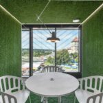Jaukumo biurui suteikia ir paviršių dangos. Akį traukia dirbtinė veja, tačiau, kaip prisimena M. Leknickas, ją tiesti buvo sudėtingesnė užduotis, nei atrodė. „Šis biuras yra modernus, naujos statybos – pagal įvairius teisės aktus reglamentuoti priešgaisrinės saugos reikalavimai, tad turėjome atsižvelgti į medžiagų degumą, o Lietuvoje niekas negalėjo pasiūlyti tai atitinkančios dirbtinės vejos. Teko nemažai padirbėti, ir jos radome užsienyje“, – pasakojo M. Leknickas. Pasak jo, visai nedaug trūko, kad ši idėja liktų neįgyvendinta.