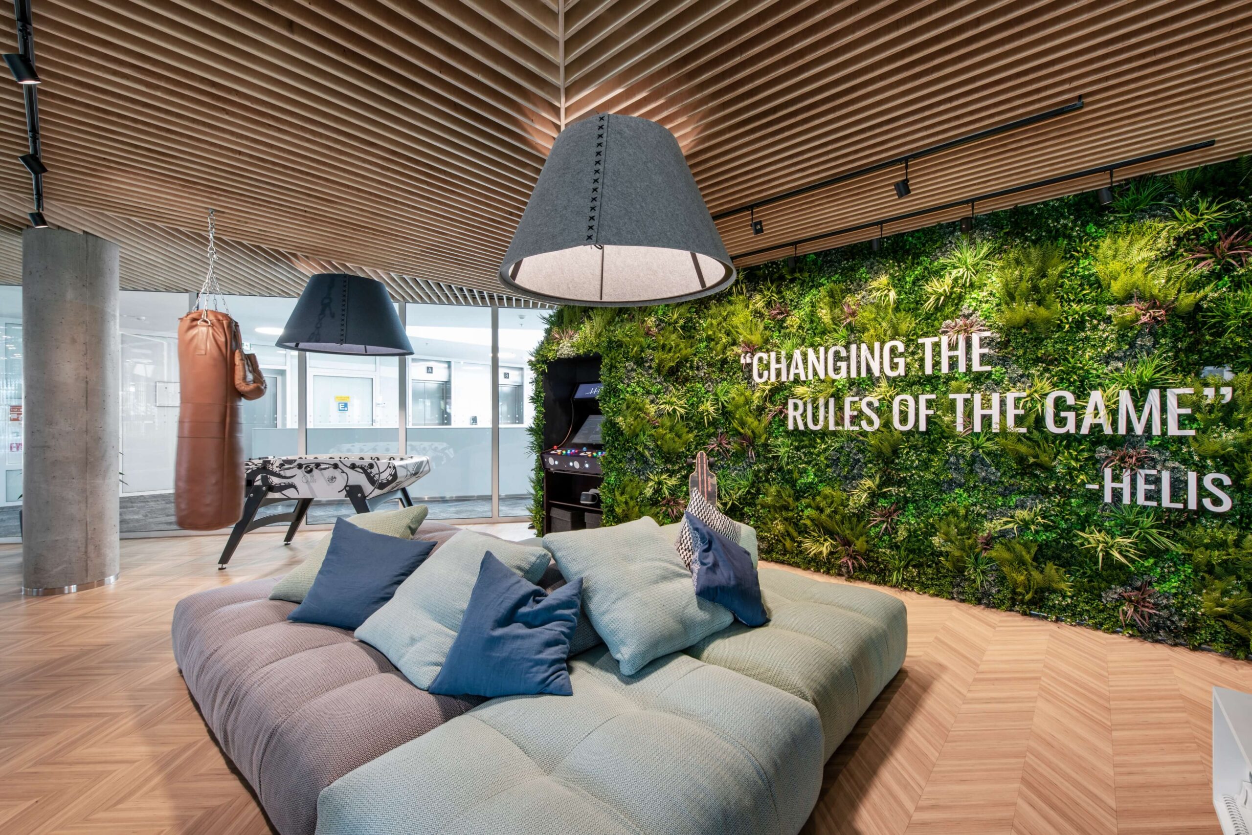 Laisvalaikio erdvėje darbuotojams įrengtos žaidimų konsolės, stovi stalo futbolo stalas, kabo odinė bokso kriaušė. Sienos dengtos dirbtine vertikalių sodų panelių danga, o joje įkomponuotas įmonės „Helis“ darbuotojų sukurtas retro žaidimų aparatas.