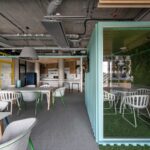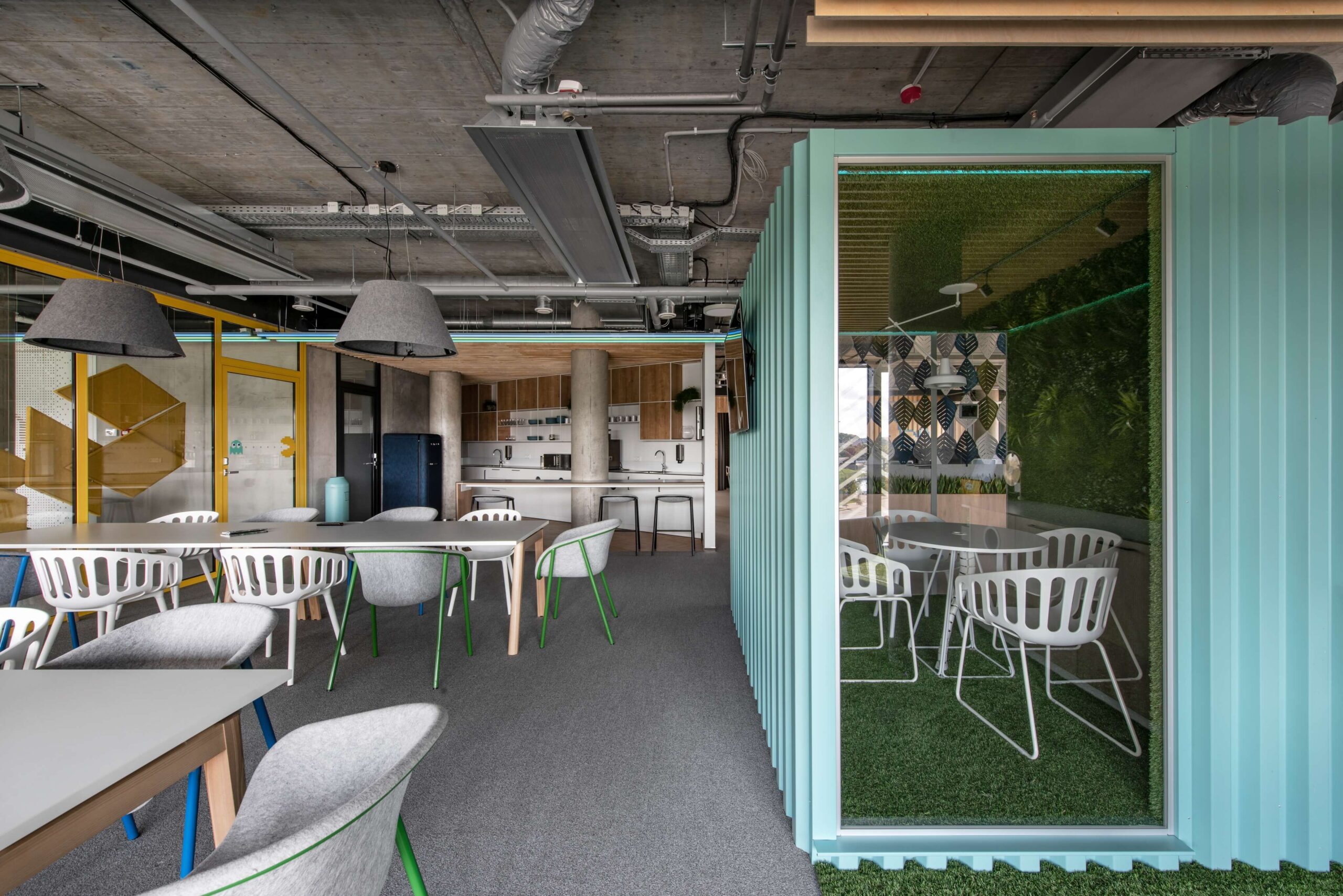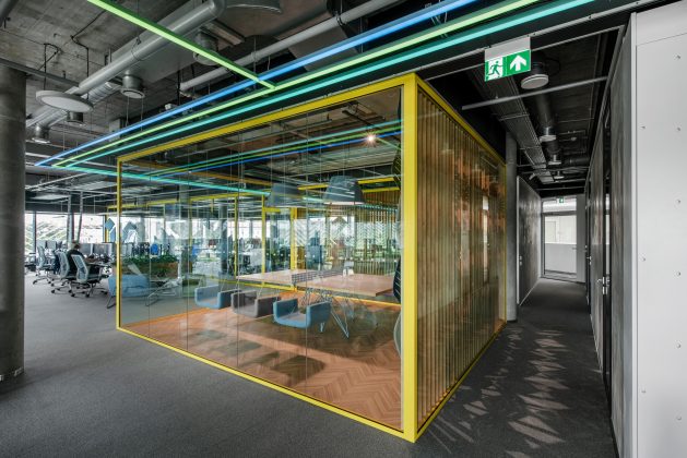 Šiuolaikiniuose biuruose Lietuvoje vis dar reti pasitarimų boksai – populiariau tokias erdves įrengti šalia sienos, sukuriant nišas. „Helis“ biure jie primena jūrinius konteinerius ir turi inovatyvią sistemą, informuojančią, kai yra užimti.