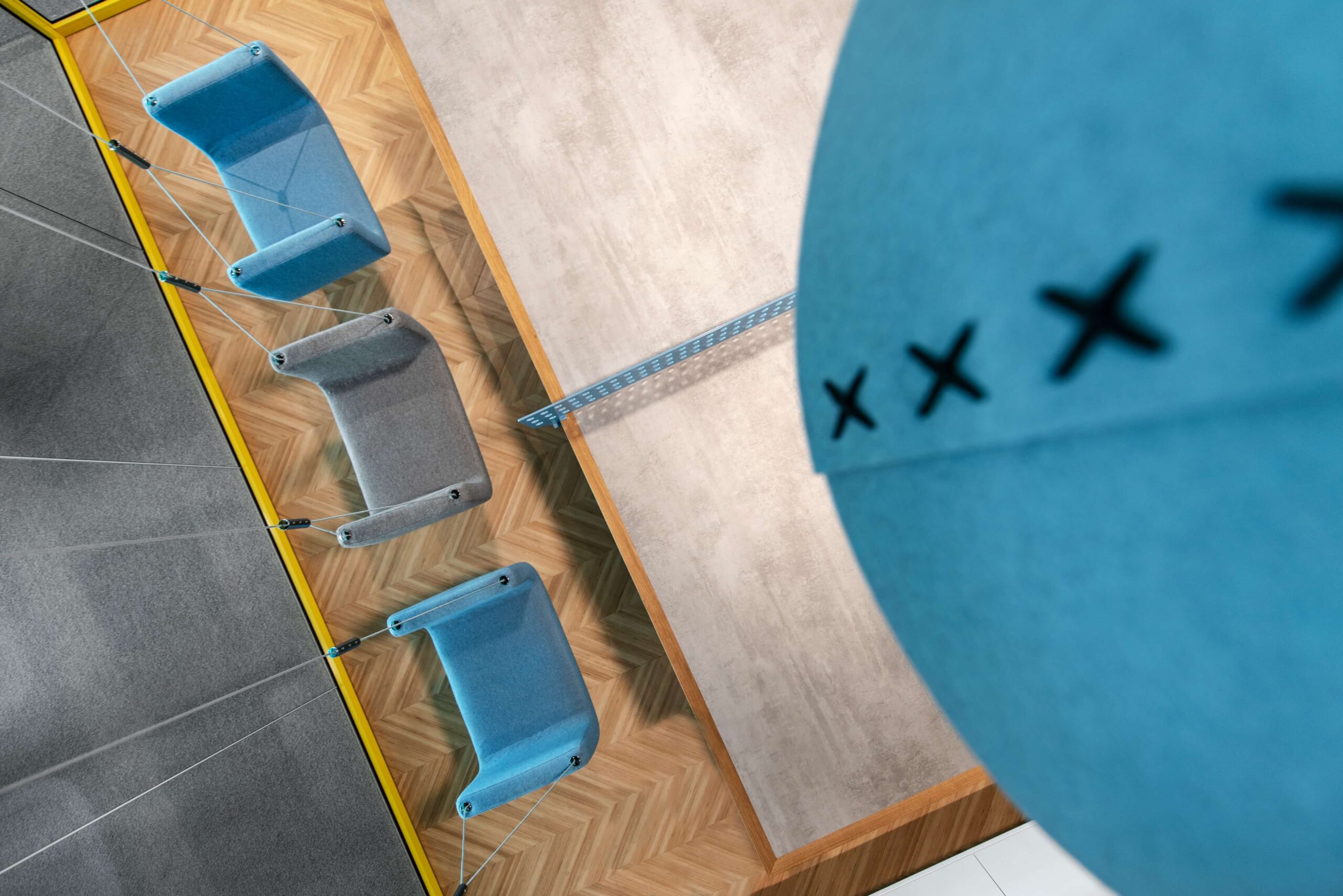 Šiuolaikiniai biurai nebėra pastovūs – jie plečiasi, darbuotojai keičiasi. Atsižvelgdami į tai architektai pasirinko modulinę sofą, kuri gali būti performuota – lengvai išardoma ir sudedama iš naujo.