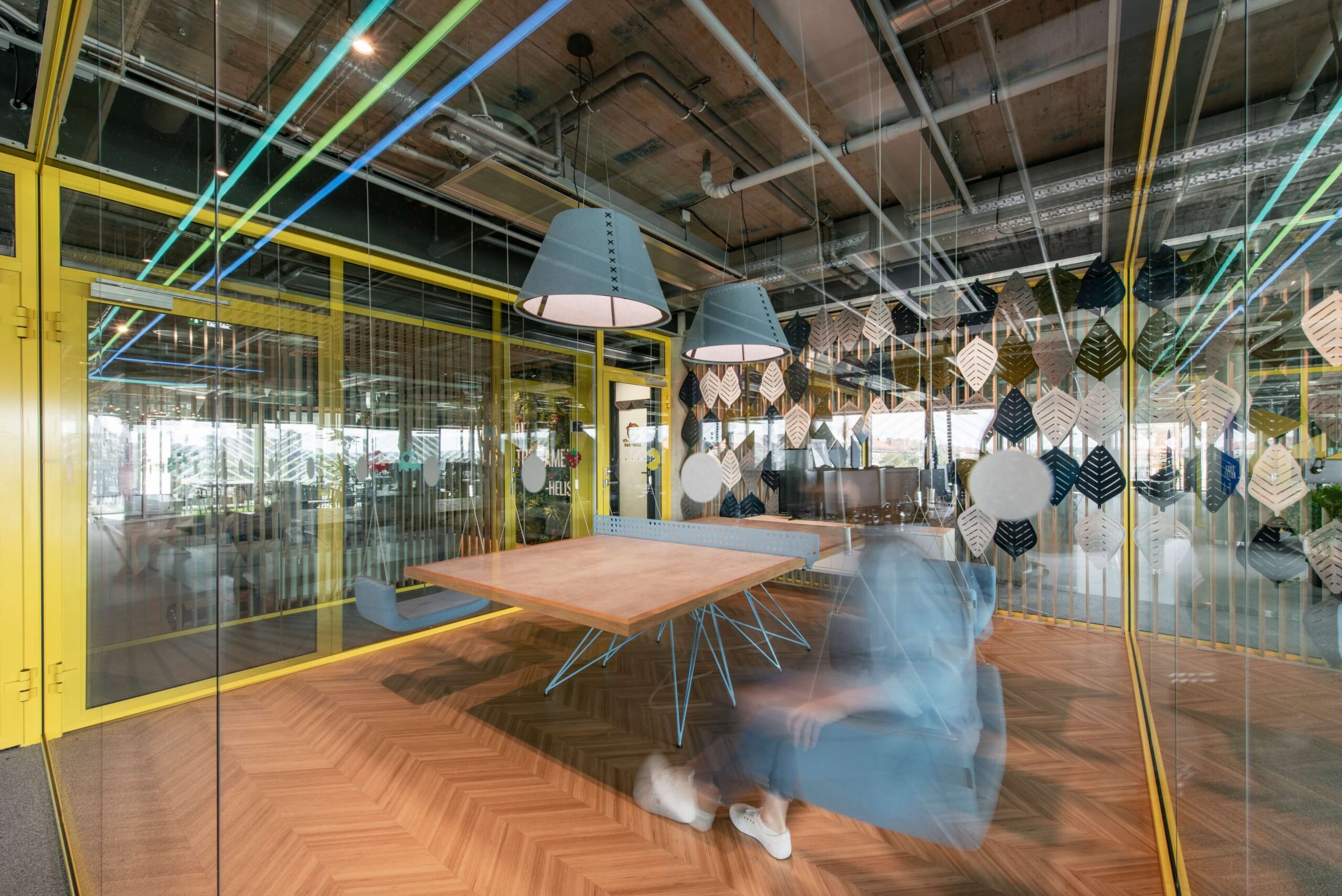 Spalvingame IT įmonės „Helis“ biure griaunamas vis dar stiprus įvaizdis, kad darbo ir pramogų zonos neturi nieko bendro. Pagrindiniame pasitarimų kambaryje darbuotojai vietoj kėdžių gali rinktis sūpynes, o darbo stalas primena teniso stalą. Pasak architekto, tai kuria smagesnę atmosferą.