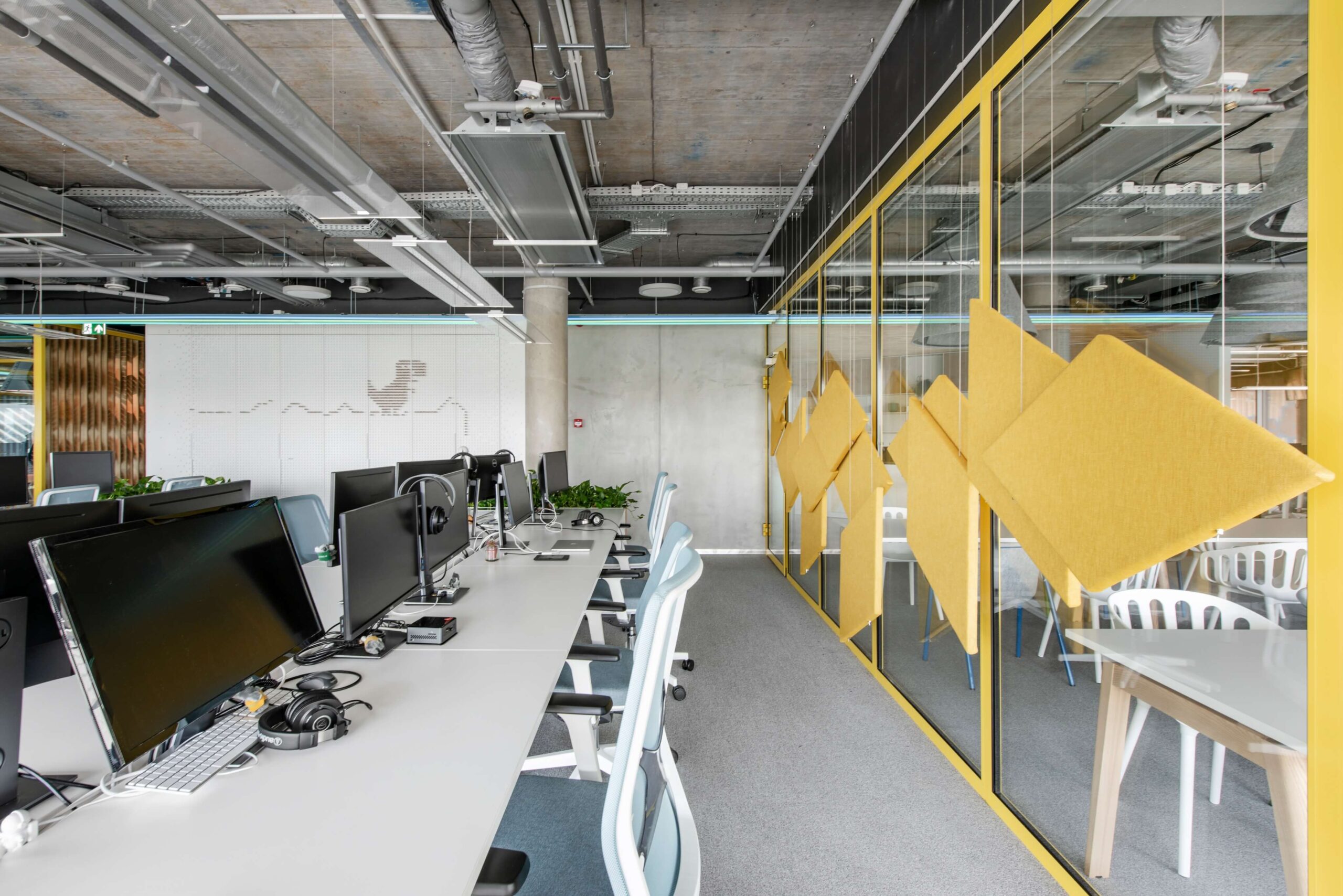 Projektuojant biurą sukurta atvira erdvė, kuri padalyta į mažesnes zonas, siekiant suvaldyti triukšmą, darbuotojus skirstyti pagal atliekamas užduotis, įrengti neformalaus bendravimo erdves. Siekiant išlaikyti atskirų erdvių vientisumą ir sukurti darnią atmosferą, panaudotos stiklinės pertvaros.
