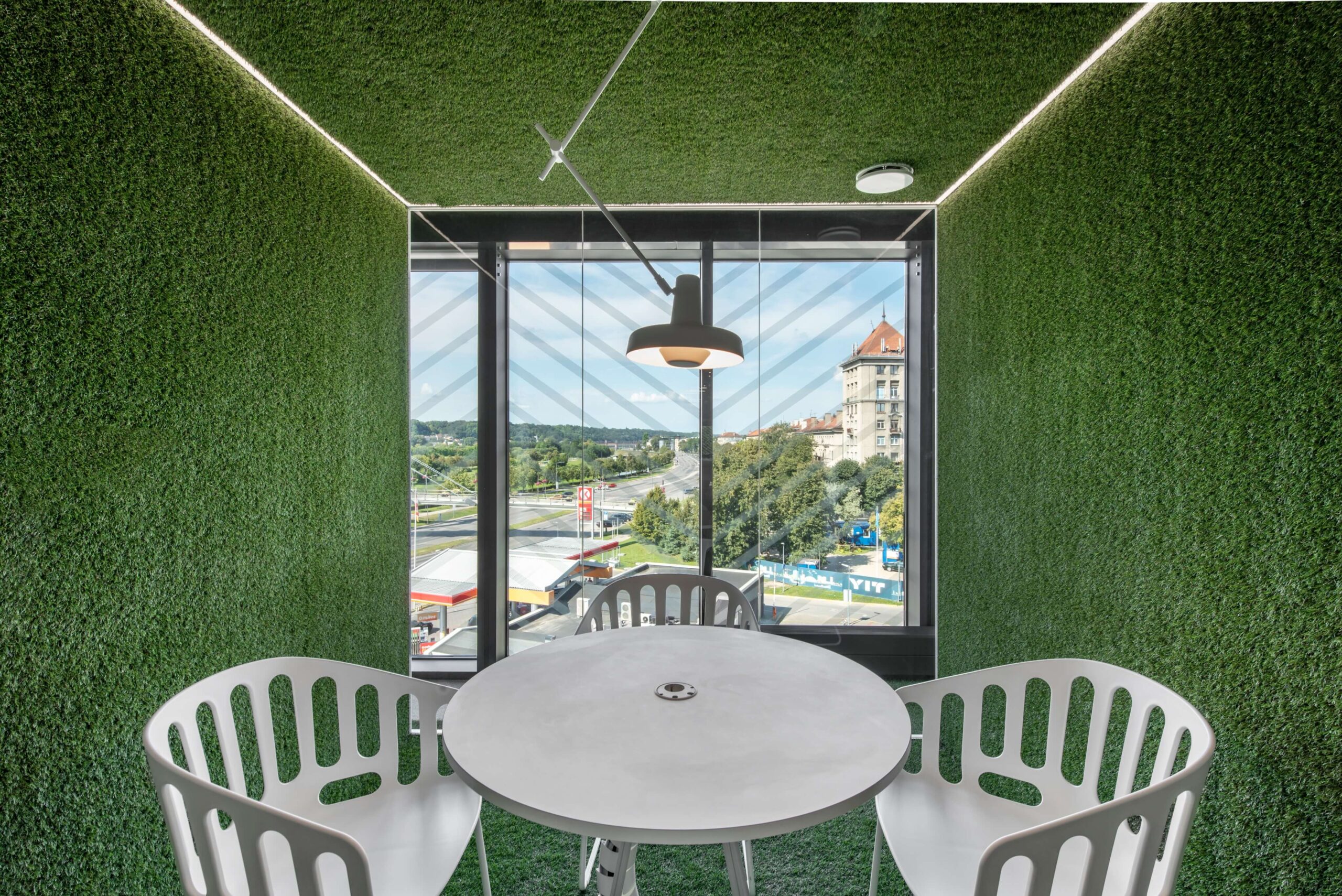 Jaukumo biurui suteikia ir paviršių dangos. Akį traukia dirbtinė veja, tačiau, kaip prisimena M. Leknickas, ją tiesti buvo sudėtingesnė užduotis, nei atrodė. „Šis biuras yra modernus, naujos statybos – pagal įvairius teisės aktus reglamentuoti priešgaisrinės saugos reikalavimai, tad turėjome atsižvelgti į medžiagų degumą, o Lietuvoje niekas negalėjo pasiūlyti tai atitinkančios dirbtinės vejos. Teko nemažai padirbėti, ir jos radome užsienyje“, – pasakojo M. Leknickas. Pasak jo, visai nedaug trūko, kad ši idėja liktų neįgyvendinta.