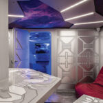 Interjero detales, formas, reljefą dizaineriams teko kurti ir piešti patiems, o šis procesas, pasak pašnekovo, buvo labai smagus. Be malonių kūrybinių darbų, teko įveikti ir daugybę techninių iššūkių. „Visų pirma, patalpų aukštis – tik 2,10 m. Tai labai komplikuota. Dar reikėjo išspręsti ventiliacijos, apšvietimo ir elektros instaliacijos įrengimo klausimus ir viską paslėpti“, – sklandaus darbo kliūtis vardija interjero dizaineris. Susidoroję su funkciniais klausimais, projekto kūrėjai perėjo prie apdailos detalių. Sienoms ir baldams jie pasirinko dažytą daugiasluoksnę fanerą, iš kurios galima išgauti įdomius ir skirtingus reljefus bei formatus. Sienų detalių efektui sustiprina aliuminio kompozito plokštė, organinis stiklas ir plastikiniai vamzdeliai. „Viską suskirstėme moduliais ir segmentais. Visi elementai buvo ruošiami CNC staklėmis. Sudėtinga tai, kad nė viena detalė nebuvo iš standartinių lengvai įsigyjamų produktų – viską reikėjo gaminti pagal mūsų sukurtus brėžinius, kuriems paruošti skyrėme labai daug dėmesio“, – pasakoja R. Špokas.