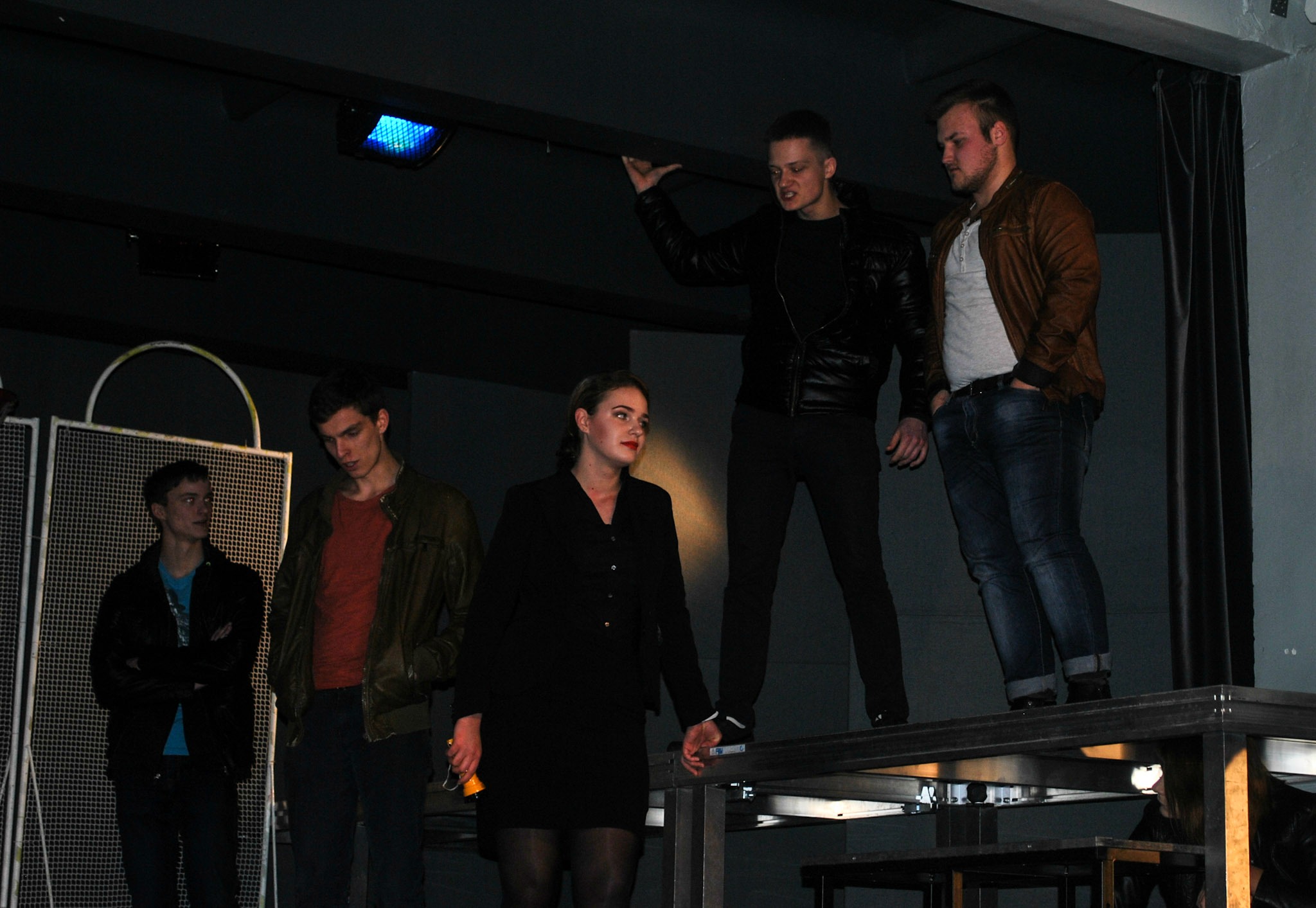 Bet atėjus lemtingam vakarui šypsenos dingsta. Užkulisiuose klausantis besirenkančiųjų šurmulio ima linkti kojos. Visi arba vaikšto ratais mintyse kartodamiesi, ką kada sakyti, arba sėdi kaip niekada rimti. Dar dabar prieš akis matau, kaip Rifas, gaujos vadas (Augustas Badauskas), susigūžęs kampe tuščiu žvilgsniu žiūri priešais save taip, kad visi ima nerimauti, plekšnoti jam per petį ir mėgina pralinksminti.